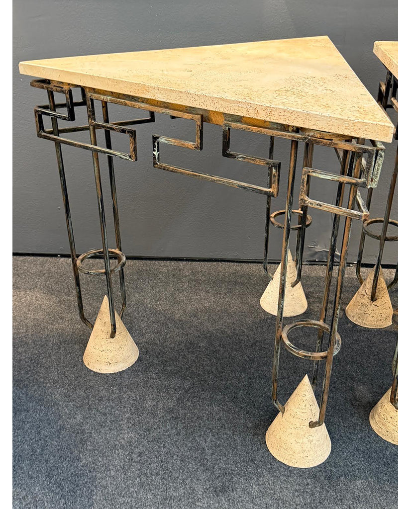 the rectangular unfilled travertine top with straight edge, over geometric pierced conforming apron, raised on contiguous circular section tripod legs with circular pierced knees, end g in cone shaped travertine feet