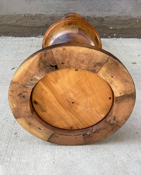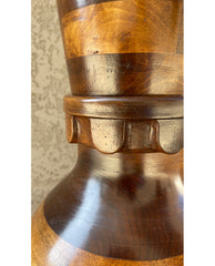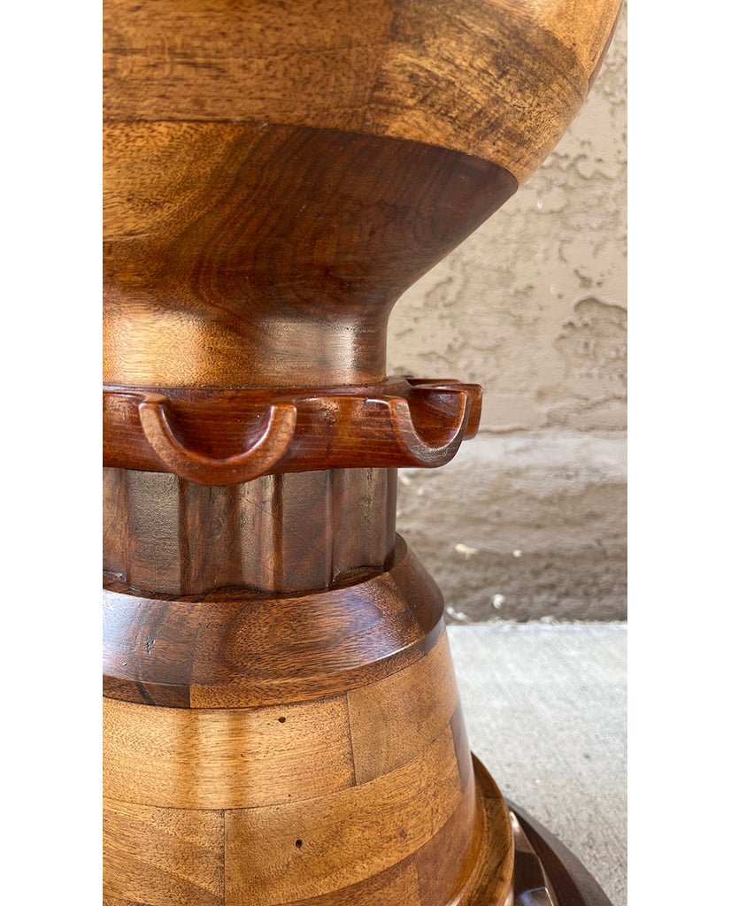 of circular section compound bulbous form, with flat center band, tapering to stylized dentil moulded narrow collar, flaring to compound moulded inset top, the scalloped waist flaring to compound moulded base, ending in canted flat foot