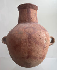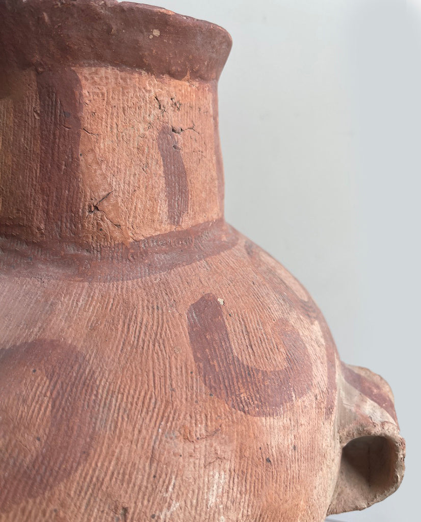 of bulbous ovoid high shouldered form with applied loop handles at the waist, rising to narrow long neck and flaring rim, tapering to rounded bottom; the whole enriched with red painted stylized human figures and banding on the neck and rim on fabric impressed ground, retaining traces of archeological patination