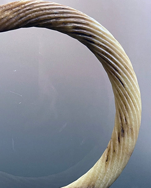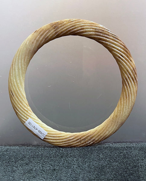 of pierced circular section form with relief carved “swirl” pattern; now displaying archeological patination