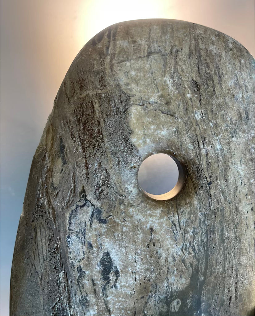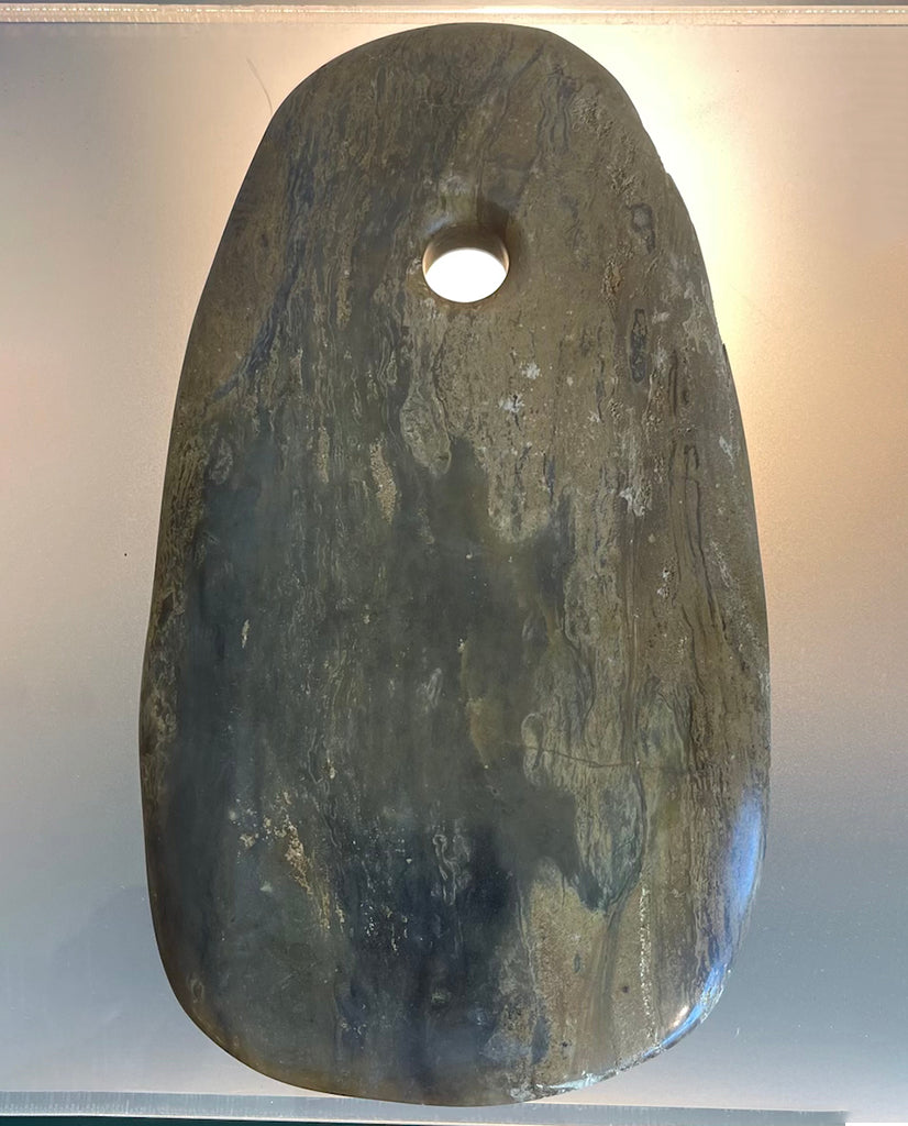 of irregular rectangular moulded and shaped axe form with bevelled edges, pierced through with a large aperture towards the narrow end; the whole mottled opaque stone of grey, beige, pale green color