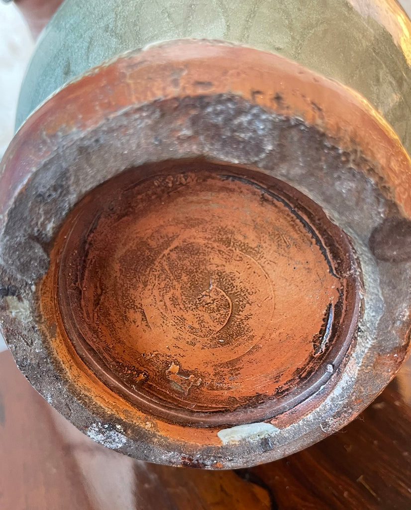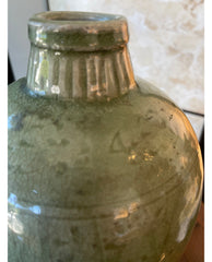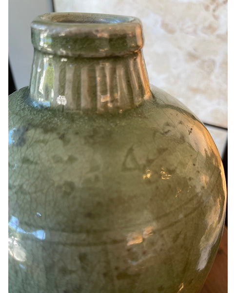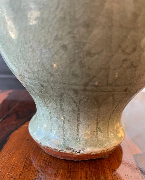 of attenuated form, with ovoid body rising to narrow fluted neck and rolled edge, raised on a tall foot, the sides finely incised with a cross-hatched pattern and lappet border encircling the foot, the whole covered in a thick sea-green glaze