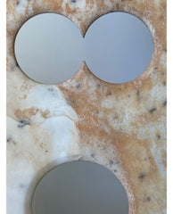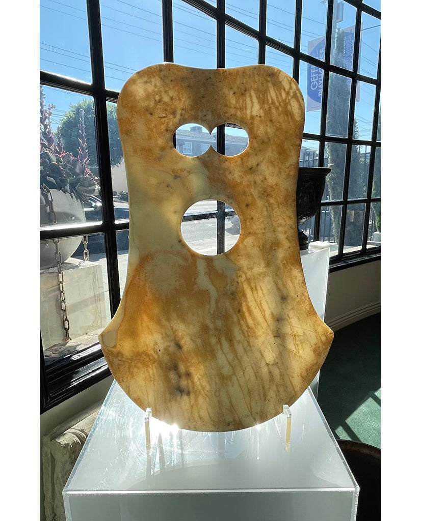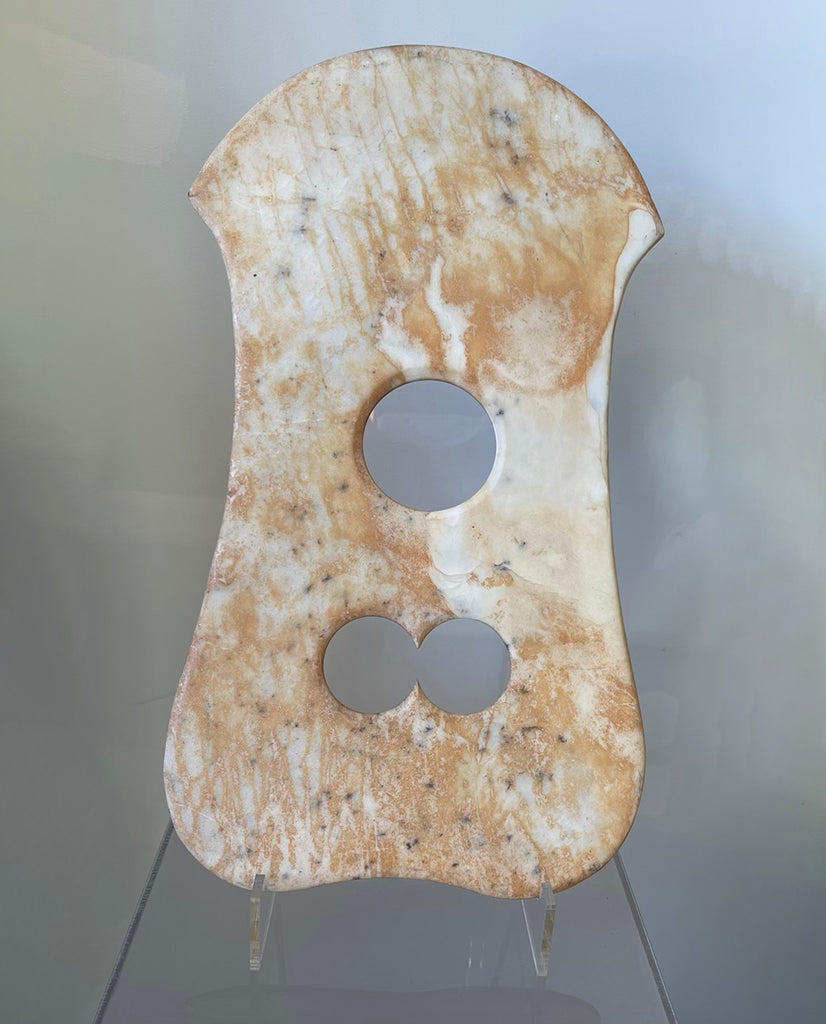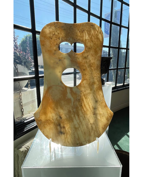 of massive thin irregular shaped and moulded rectangular form, possibly depicting an ax head, with circular beveled piercings