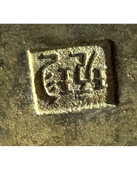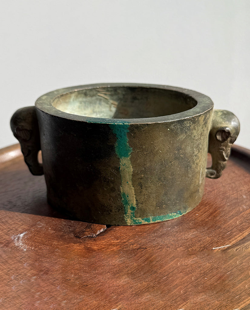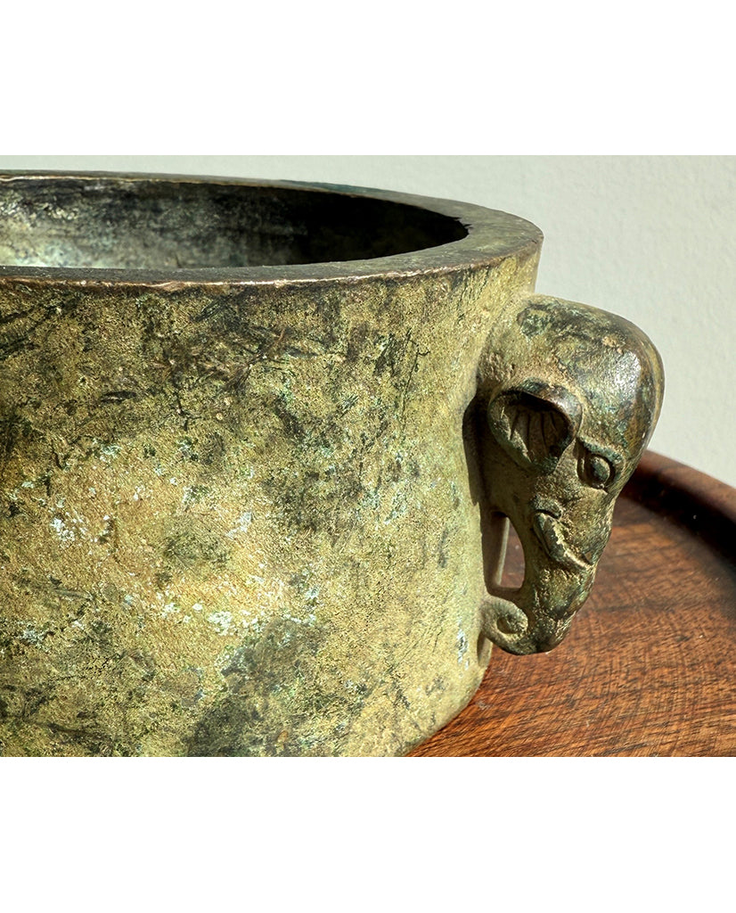 of deep dish massive form slightly tapered sides fitted at the shoulders with fully realized pierced elephant heads, rising to flat rim and ending in flat foot; the whole retaining bronze verdigris patination with the underside stamped with makers mark in Chinese characters : Shuì lǐ