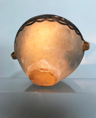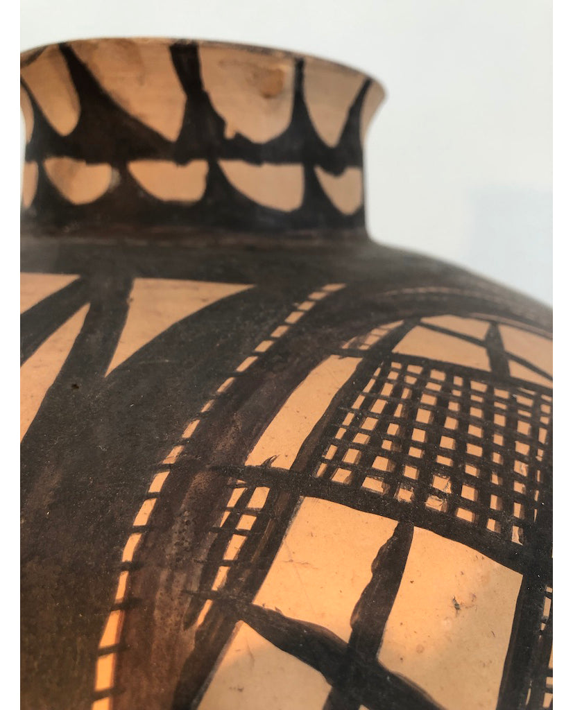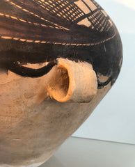 of bulbous ovoid high shouldered form, fitted with loop handles at the waist, rising to narrow neck, slightly flaring at the rim and steeply tapering to flat foot; the whole enriched with painted geometric cross-hatch circular reserves with scalloped band at the waste and stylized water bands on the neck and retaining traces of archeological patination - restorations