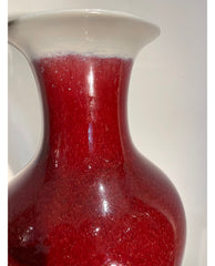 of high shouldered ovoid form, rising to narrow neck, flaring to wide rim, ending in low foot; the whole enriched with thick red glaze, fading to white rim and interior