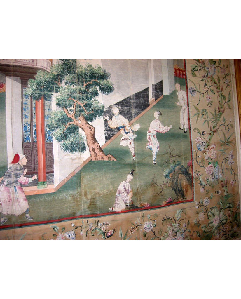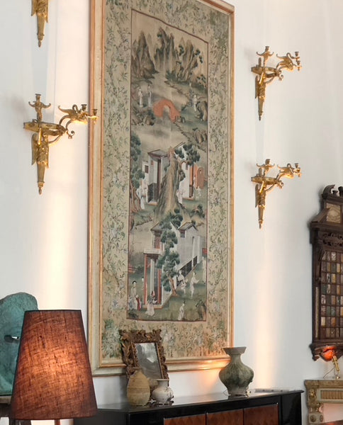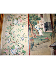 depicting figures in various domestic and leisure activities in classic rural pavilions set within landscape garden; framed with meandering flowering vine; now fitted to parcel gilt and volute painted frame