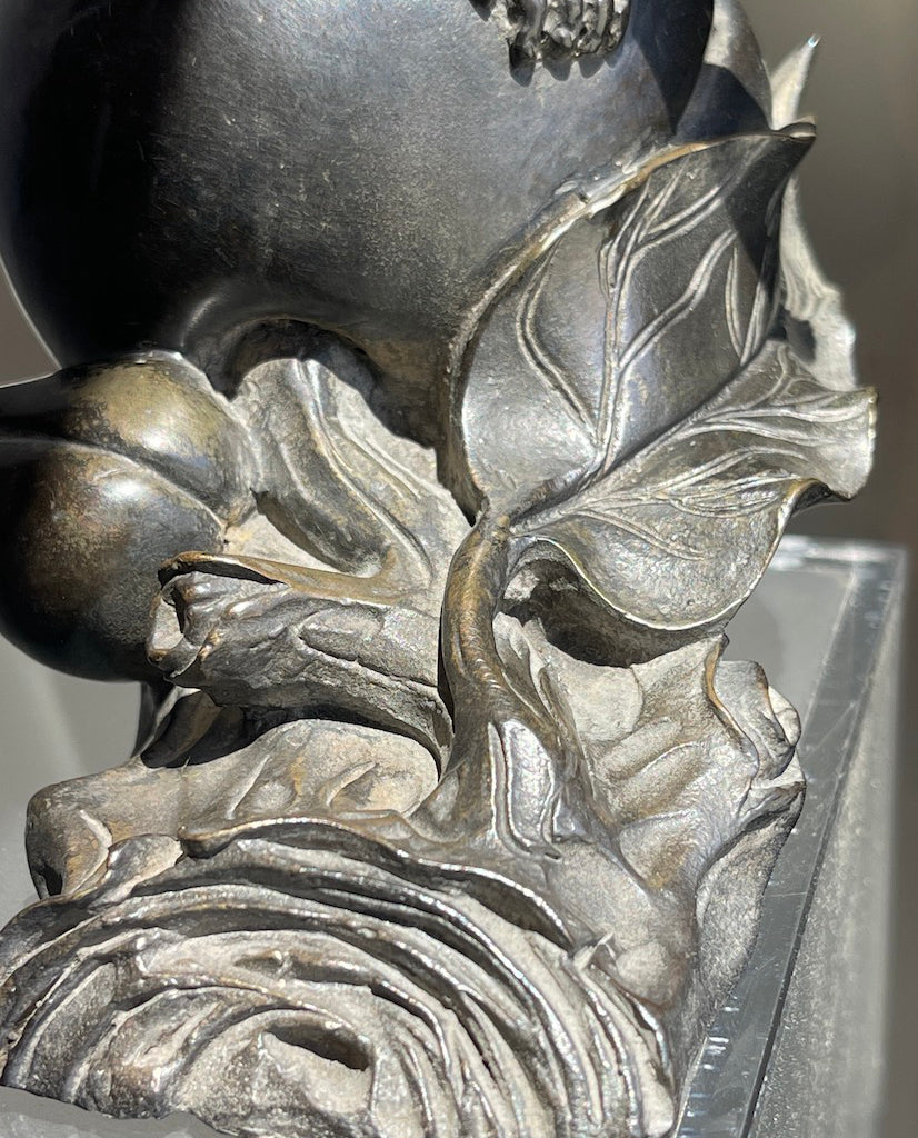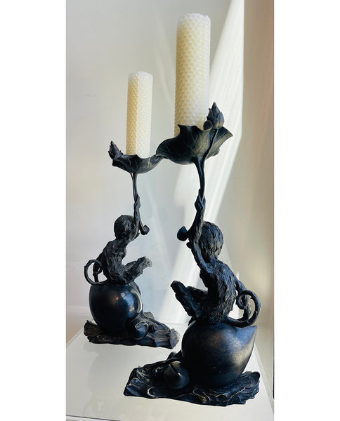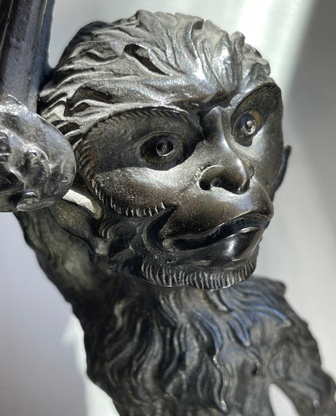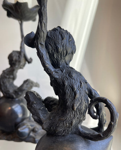 each fully realized sculpted form of an animated furry monkey with expressive friendly expression, scrolling tail, seated on foliate lotus bud, right hand raised holding a wavy and fluid lilly pad with candle spike; the whole resting on sculpted fragment of a log