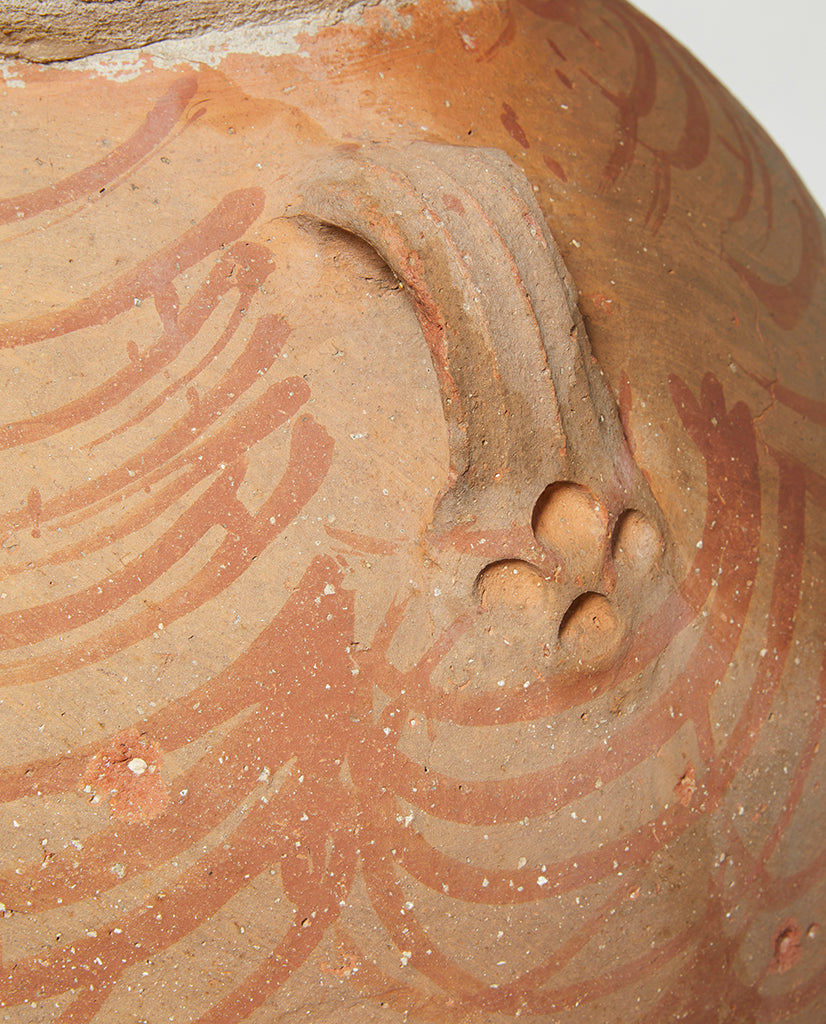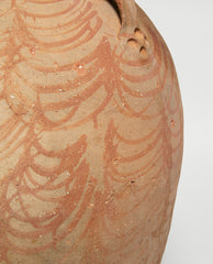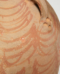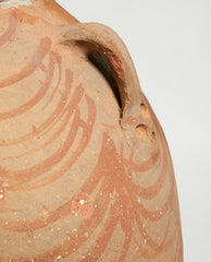 of ovoid high shouldered form, fitted with strap handles tapering base with spout on flat bottom; the whole enriched with abstract rust colored swag decoration