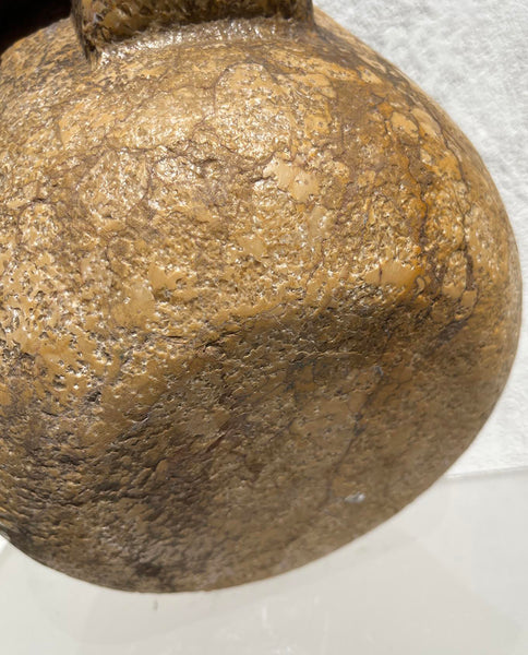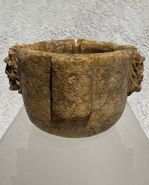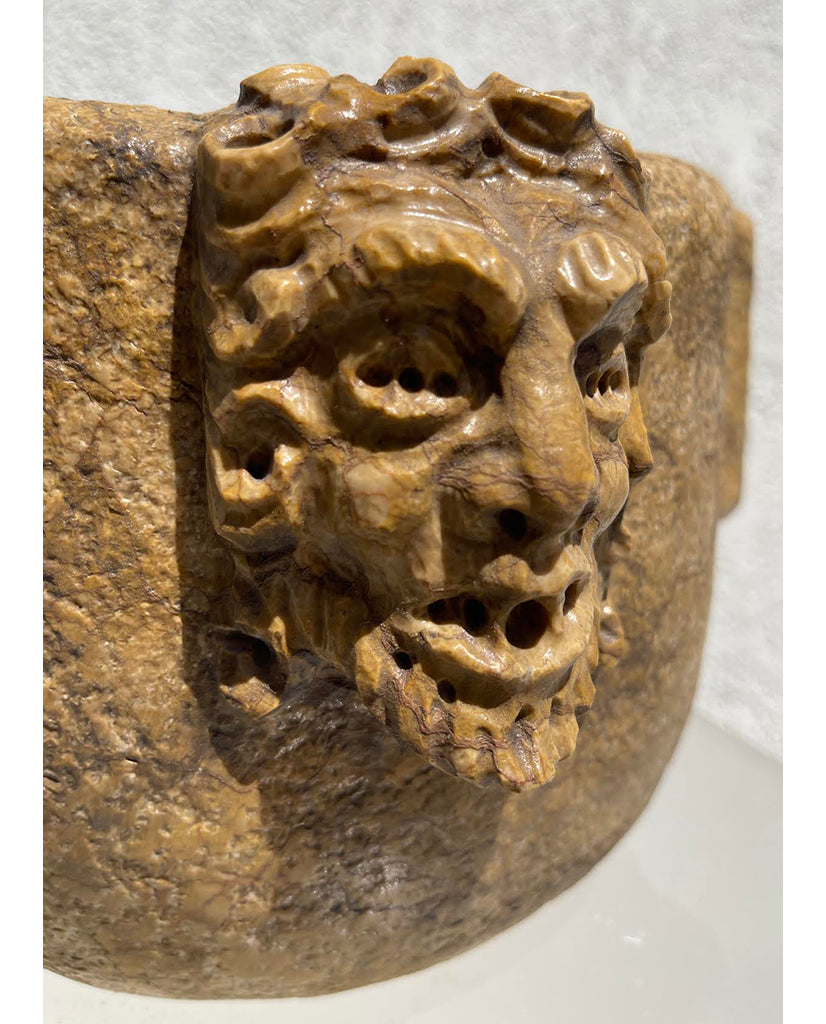 of carved and molded ovoid deep dish form, rising with straight sides to bulbous rolled edge, the opposing side with fully realigned carved saytr heads each with deep set eyes, open mouth, flowing beard, mustache and hair, opposite sides with carved demi-lune hands and spout