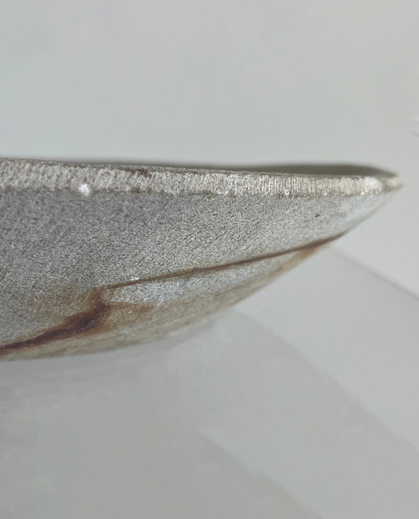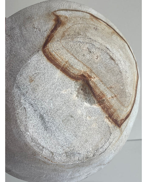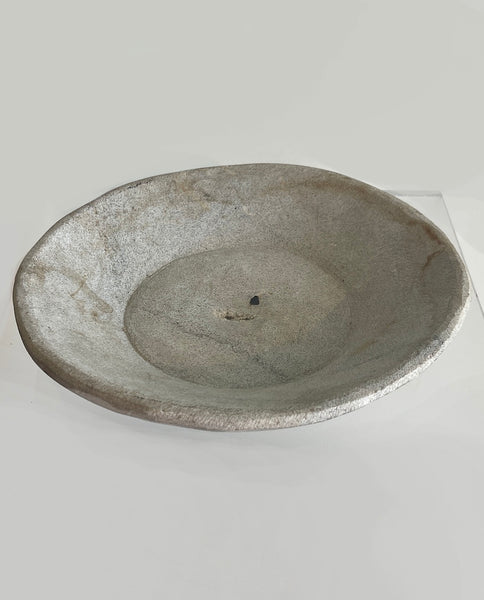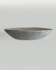 of massive highly figured circular shallow dish form, tapering to rolled edge and ending in flat base