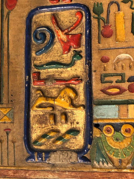 of degraded rectangular form, the surface deeply encased with polychrome hieroglyphics, the name “Luigi” visible in one cartouche indicating the piece was more than likely a commission ed “artifact” from an Italian tourist; now mounted in velvet lined and giltwood case