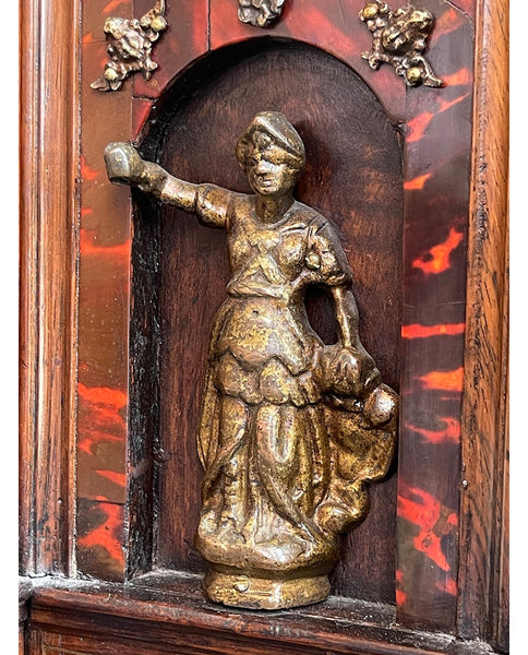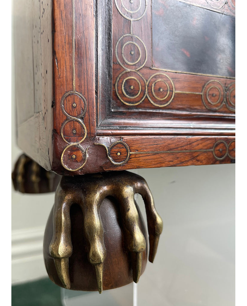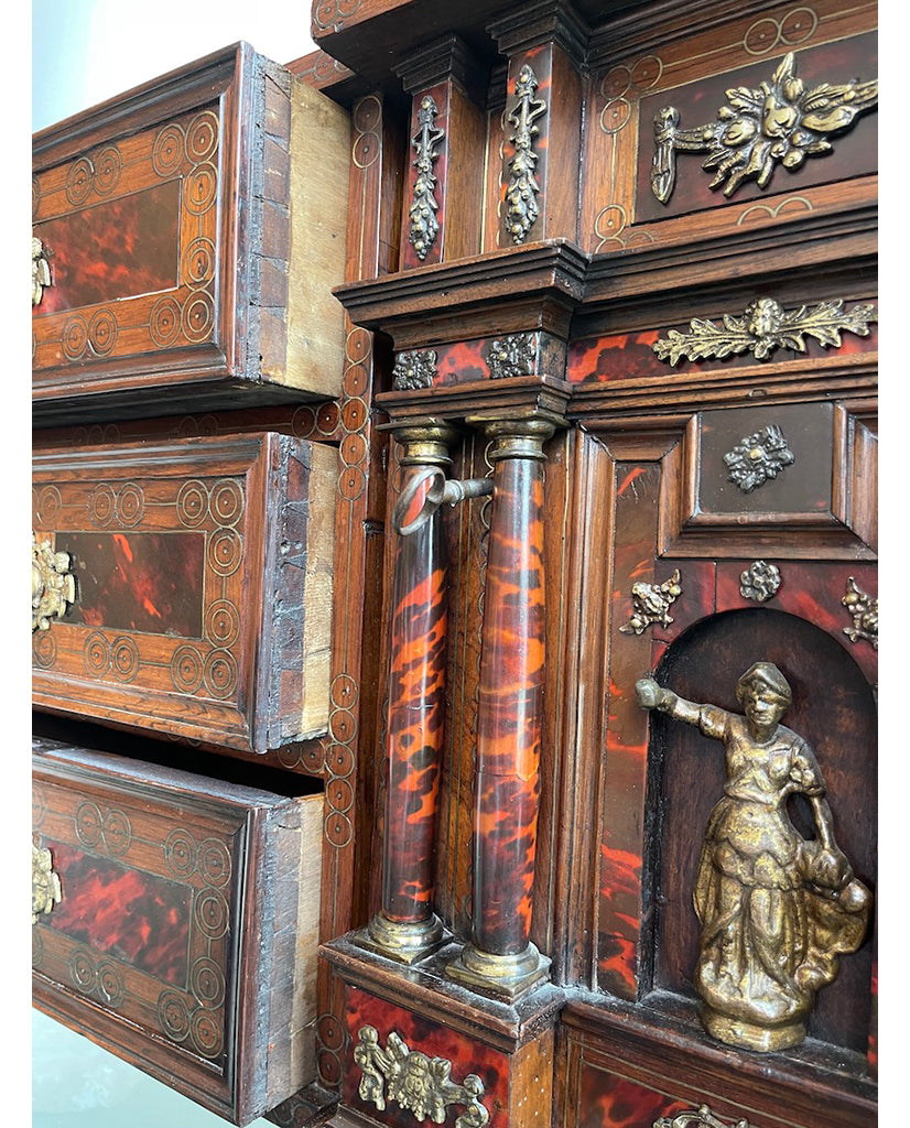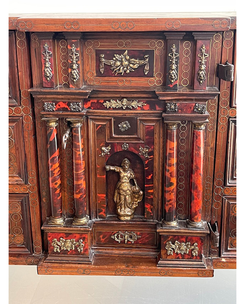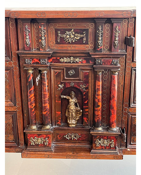 the rectangular case with center extension, fitted with pierced “D” ring handles and foliate plates, enclosing 6 short drawers, flanking hinged door, fitted with four doric columns, centering male figure in classical dress, left arm extended, surmounted by architrave, enclosing 4 short drawers; the whole enriched with satinwood stringing, brass foliate and figural escutcheons, inlaid circular brass patterns and various foliate and floral mounts, raised on eagle talon ball feet
