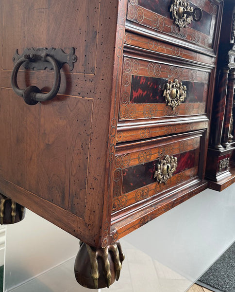 FLEMISH BAROQUE WALNUT, SATINWOOD, TORTOISE SHELL AND BRASS INLAID COFFRE