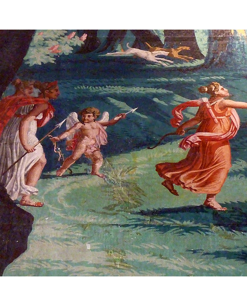 Telemachus and maidens on the hunt in a wooded scene, tracking a deer