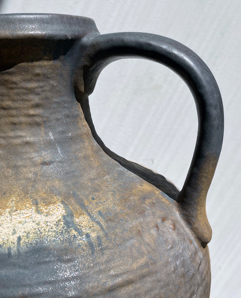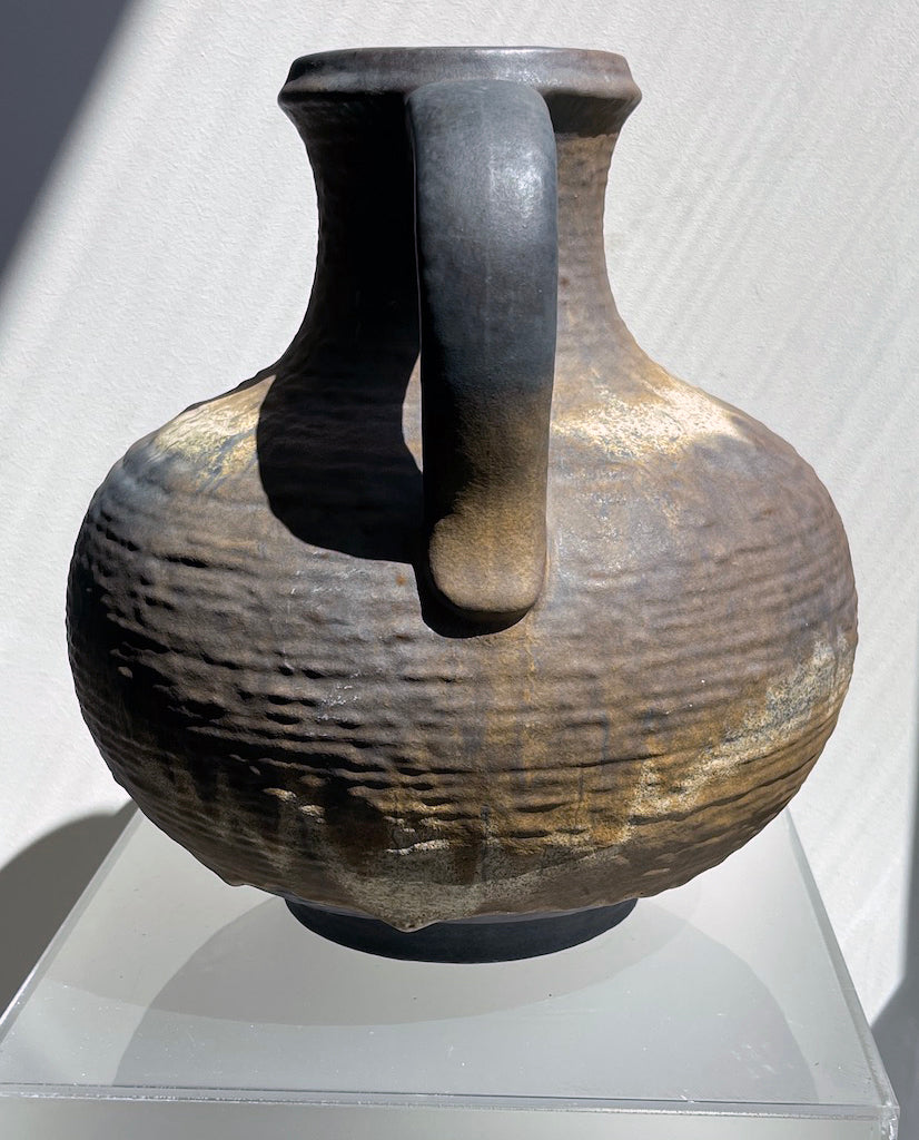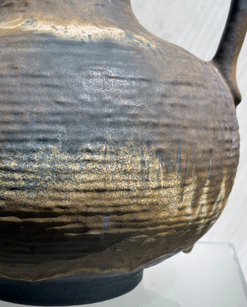 of bulbous ovoid form exhibiting subtle ribbed body, fitted with massive shaped and molded rectangular section pierced “d” ring handle to the neck and waist, rising to flaring rim and tapering dramatically to ring foot; the whole enriched with dripping Matt glazes in brown and off white tones