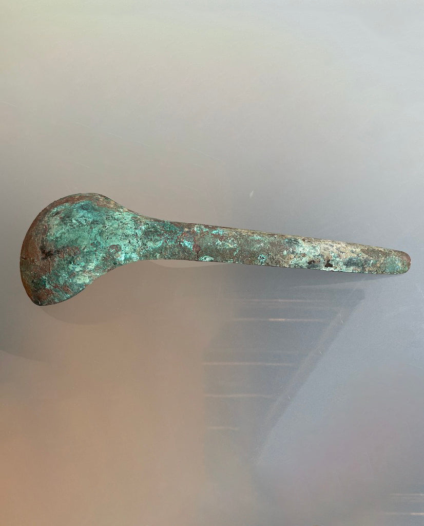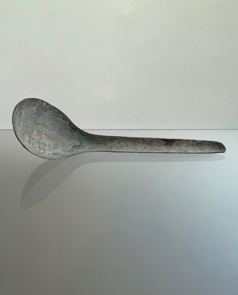 of shaped and molded concave form, narrow at the handle, flaring to create spoon; the whole with bronze verdigris archeological patination