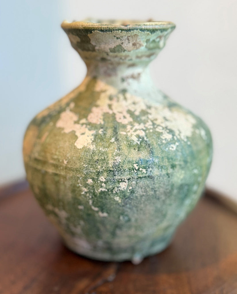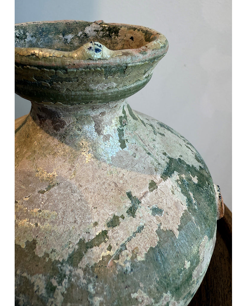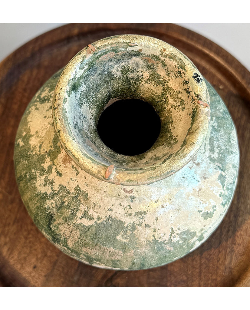 of bulbous ovoid form rising to narrow neck and flaring everted rim, tapering to flat bottom with kiln supports; the whole displaying degraded iridescent green lead glaze and traces of archeological patination