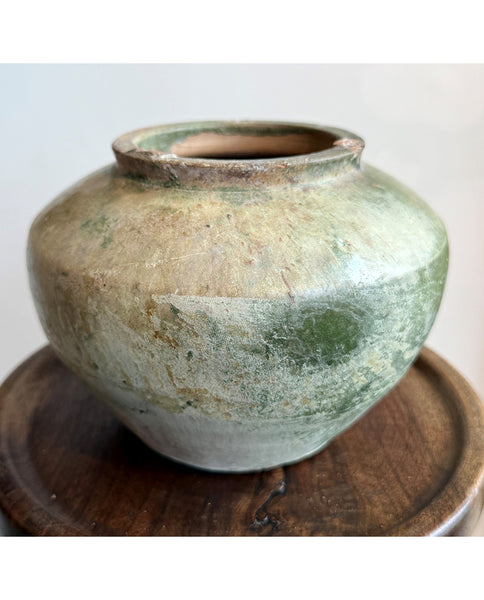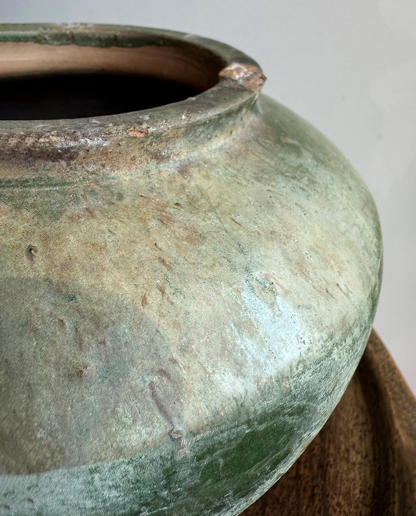 of bulbous ovoid high shouldered form, tapering to rolled rim and tapering gently to flat foot; the whole displaying archeological patination