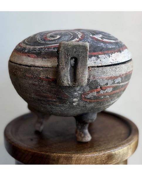 of deep dish ovoid form fitted with flaring pierced rectangular molded handles, surmounted by gently domed conforming cover, rising to extended flat band; the whole raised on anthropomorphic shaped tripod feet and displaying traces of original geometric white and red banding on the lid rim and body, as well as cloud swirls on the lid