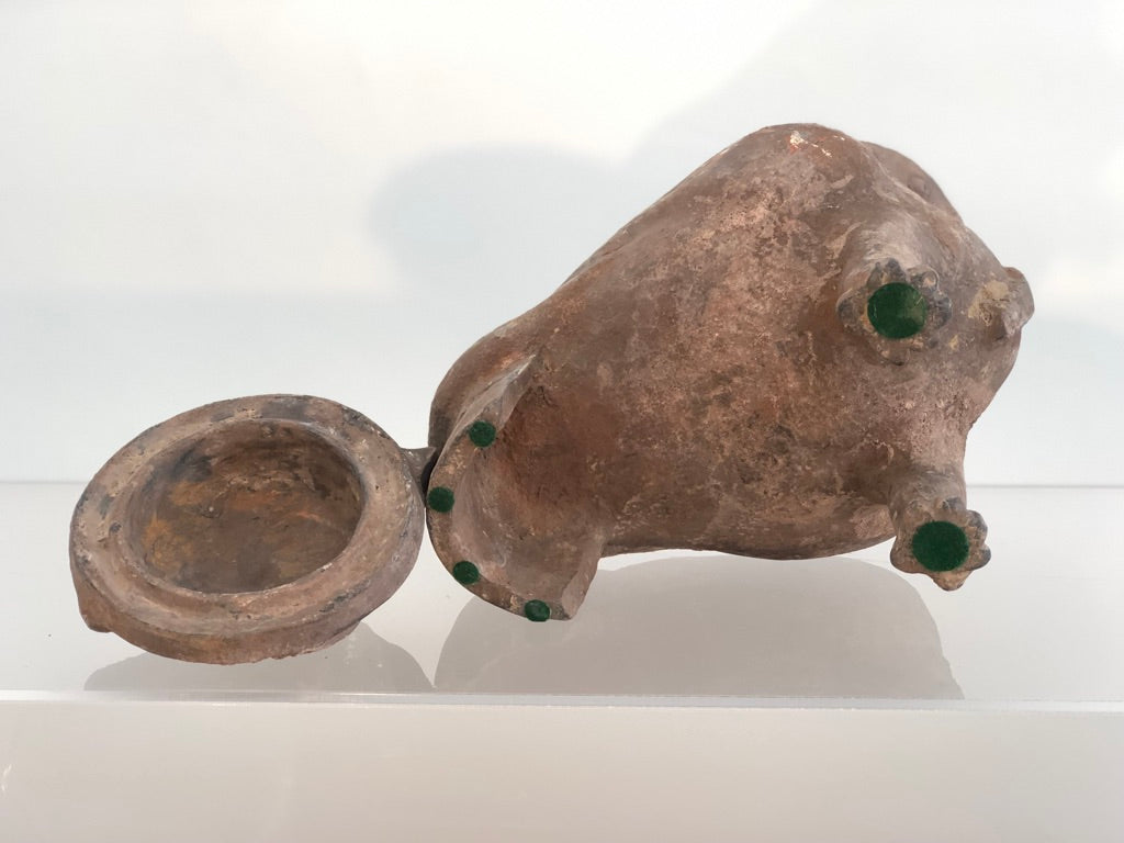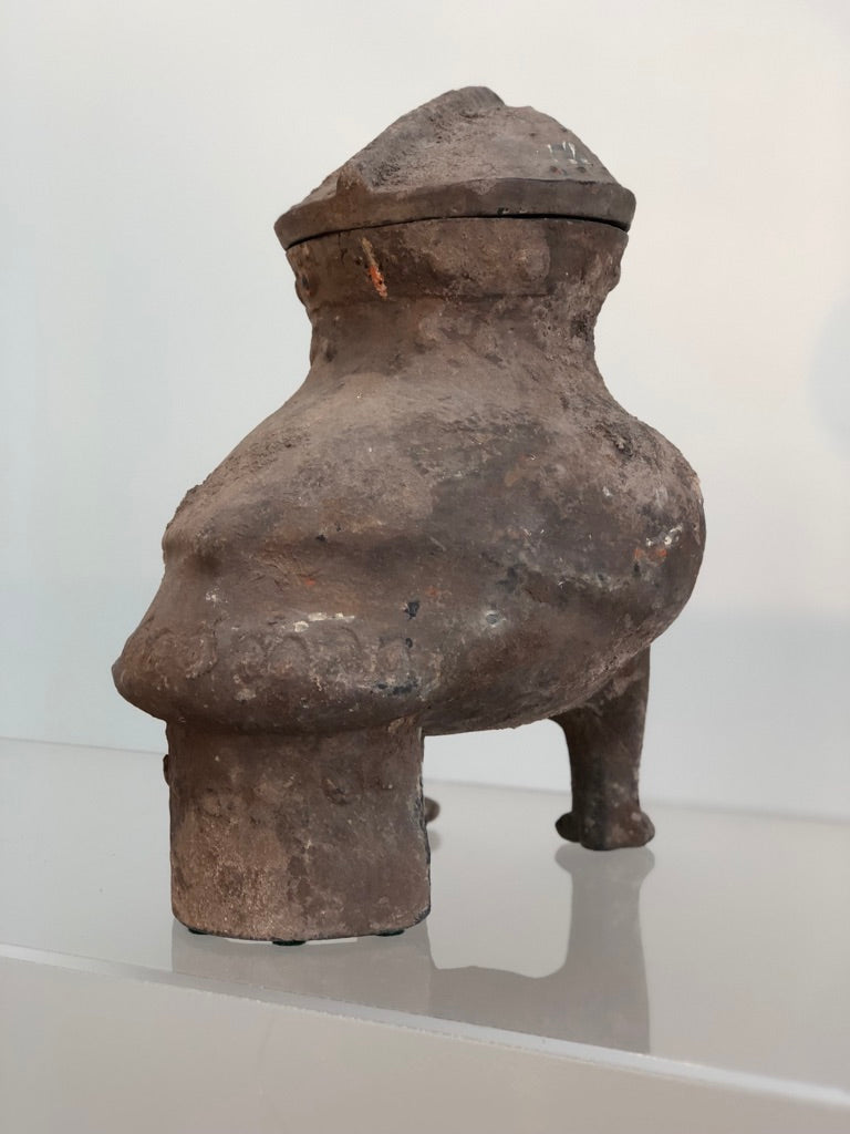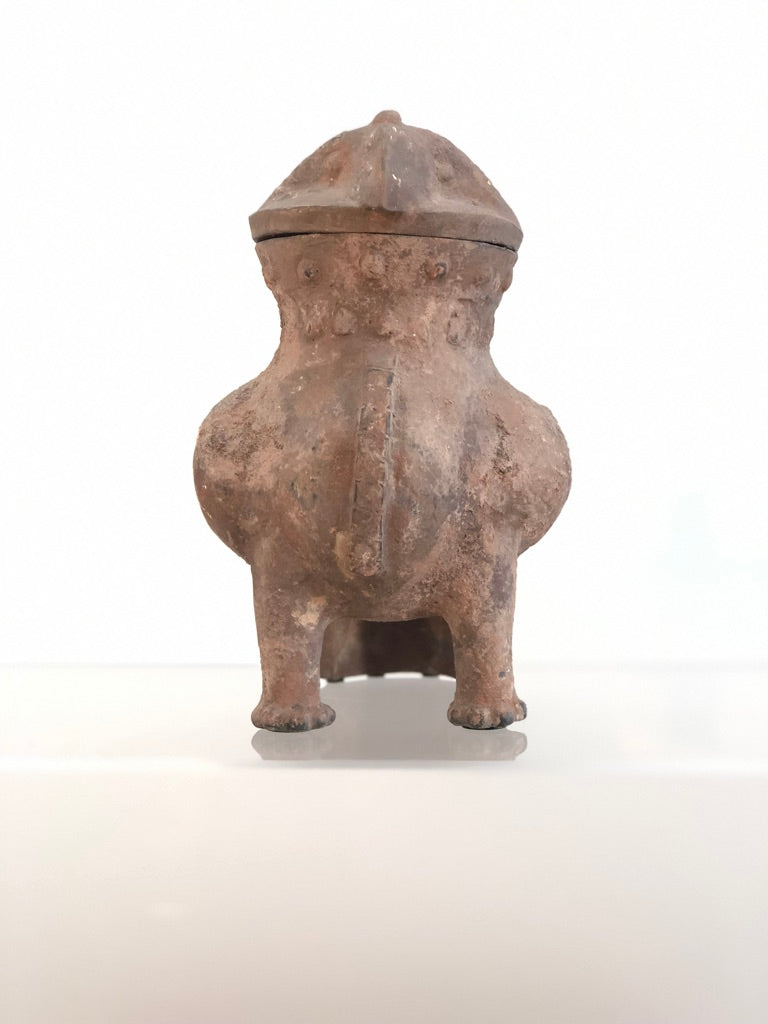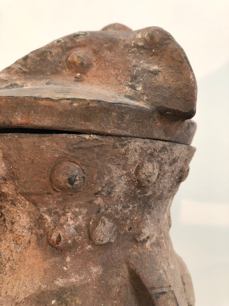 of fully realized sculpted and molded stylized sitting bird form, it’s wings gently sculpted in relief, the chest with rectangular flaring ridge, rising to tapering neck with flaring studded rim enclosing hollow interior, surmounted by conforming sculpted and molded lid in the form of the birds head, with similar rectangular ridge crown, sculpted eyes and strong beak; the whole raised on fan tail and talons, displaying traces of polychrome enrichment and archeological patination