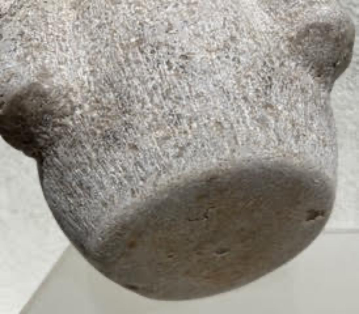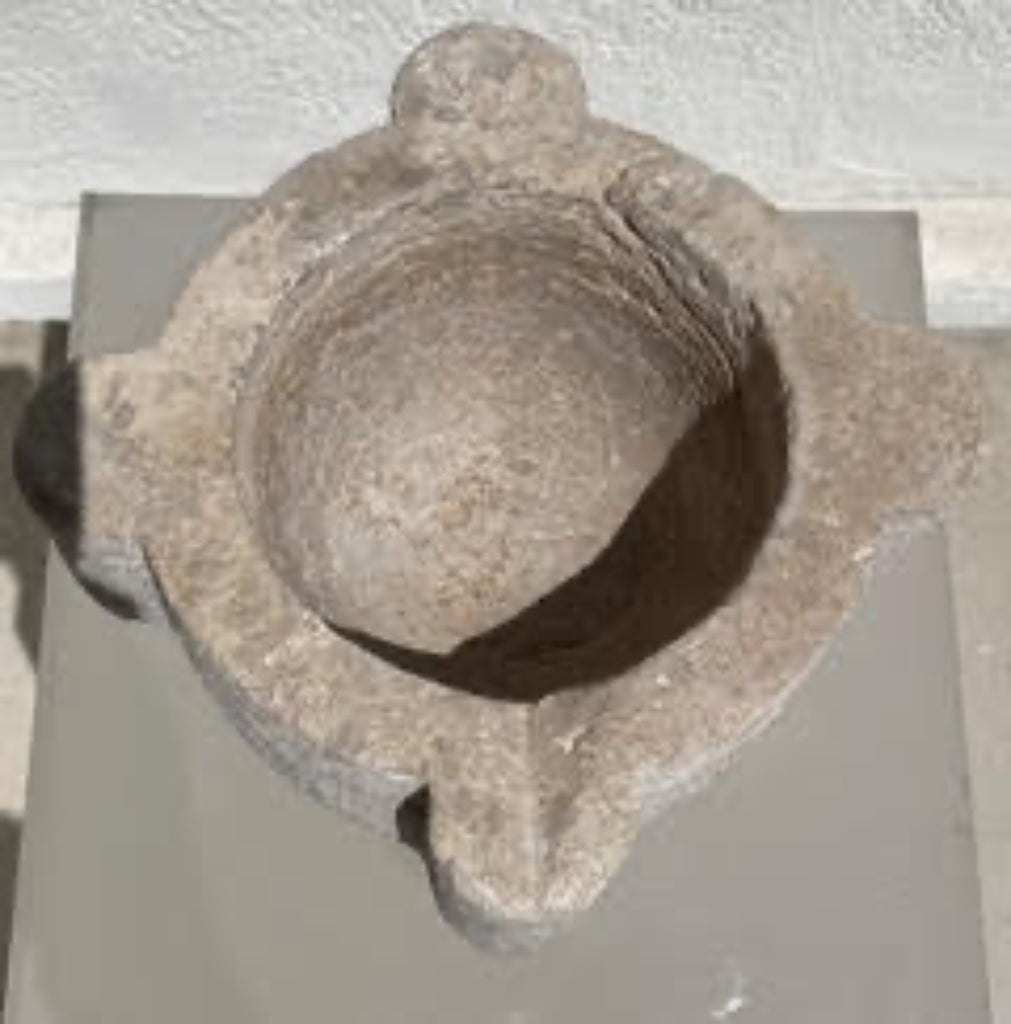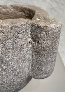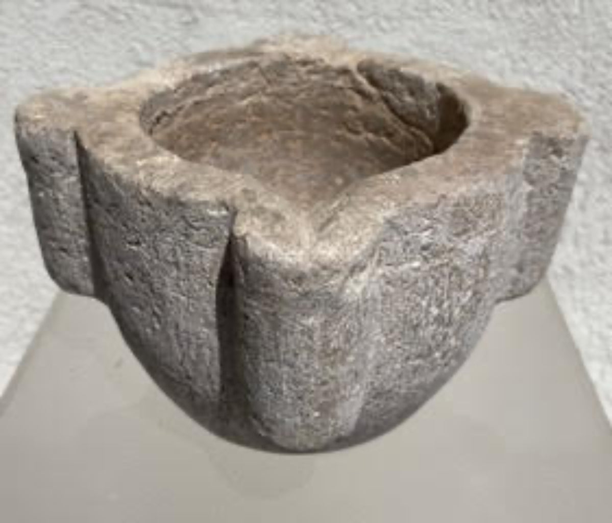 of deep dish ovoid form with three concentric corbels and spout at the flat rim, tapering to flat bottom