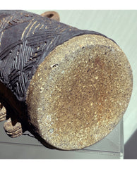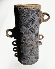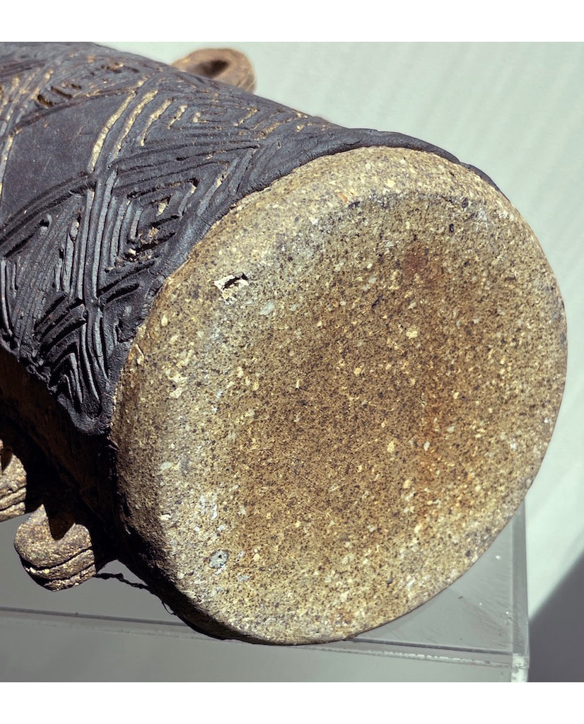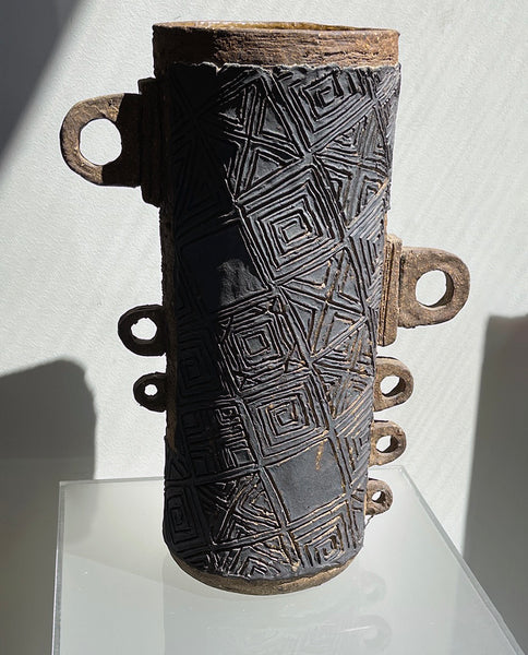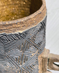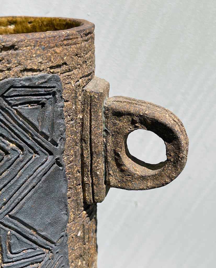 of two tone colored beige and grey circular section vasiform shape with applied pierced circular “d” ring type seemingly random handles, rising to flat rim and raised on flat foot; the whole enriched with geometric diamond point pattern with mottled ochre glazed interior