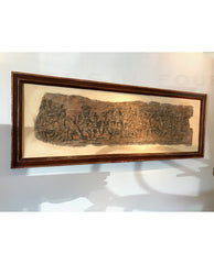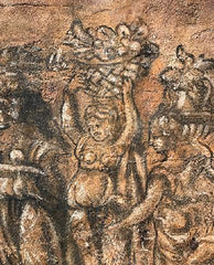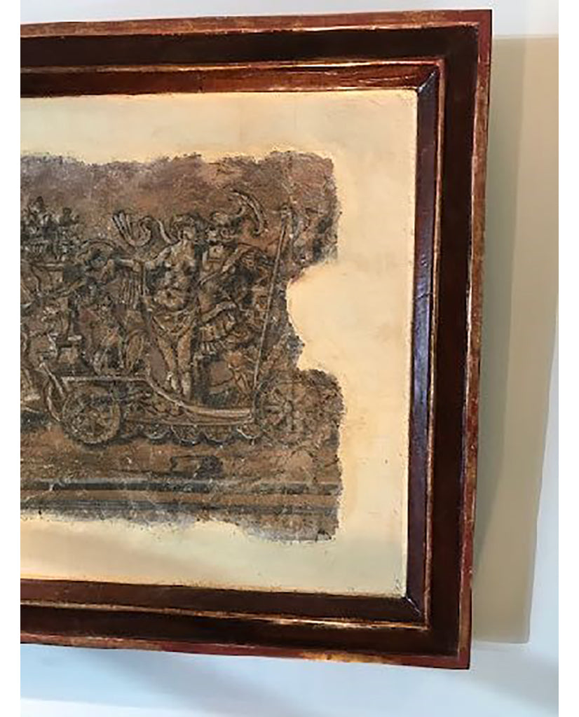 of irregular shape depicting festival procession of triumphant military figures in horse drawn carriage, proceeded by maidens and putti painted in black with white highlights on ochre ground; now in lacquered and parcel gilt frame