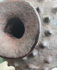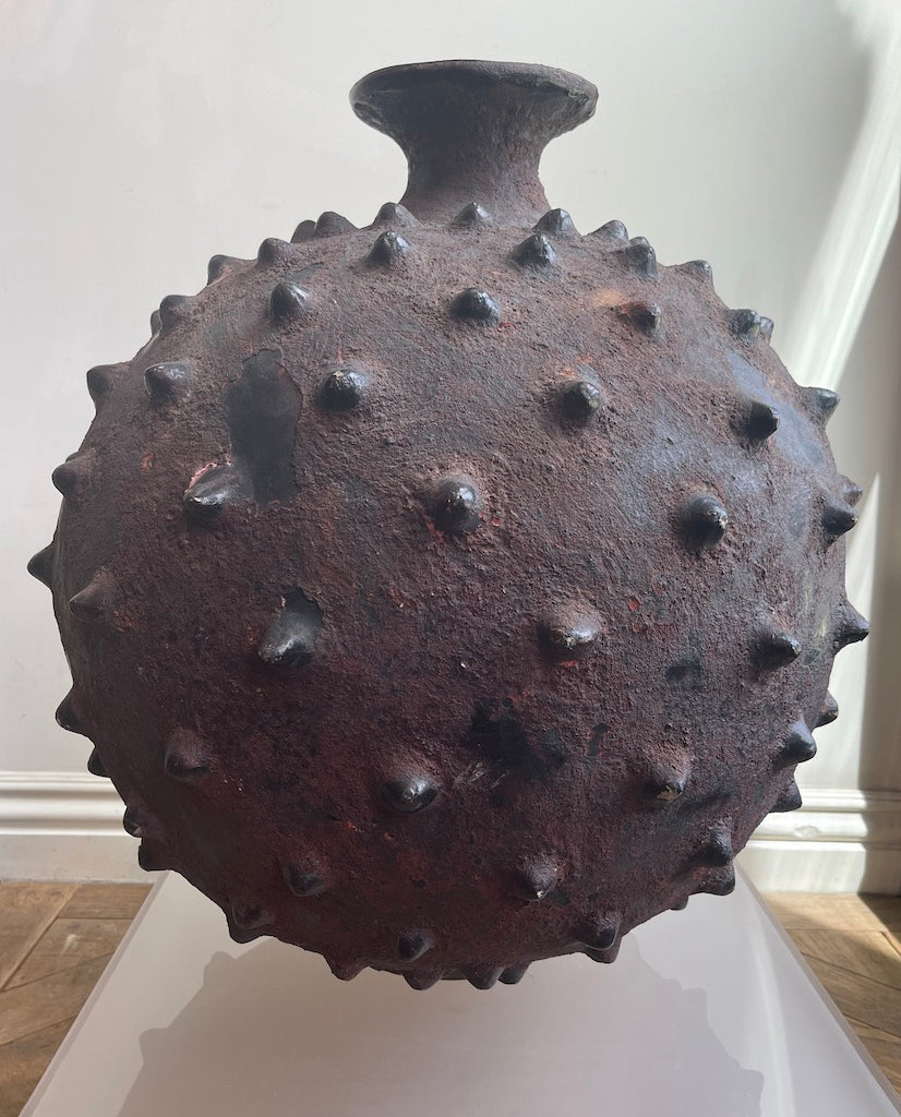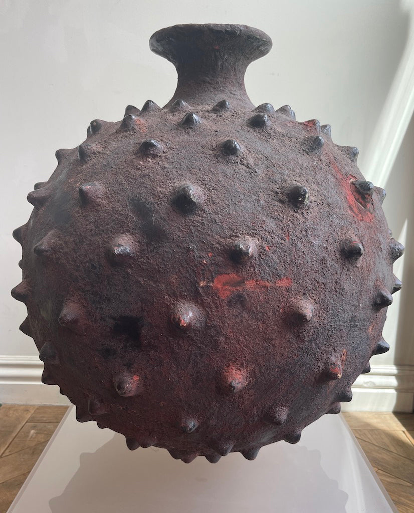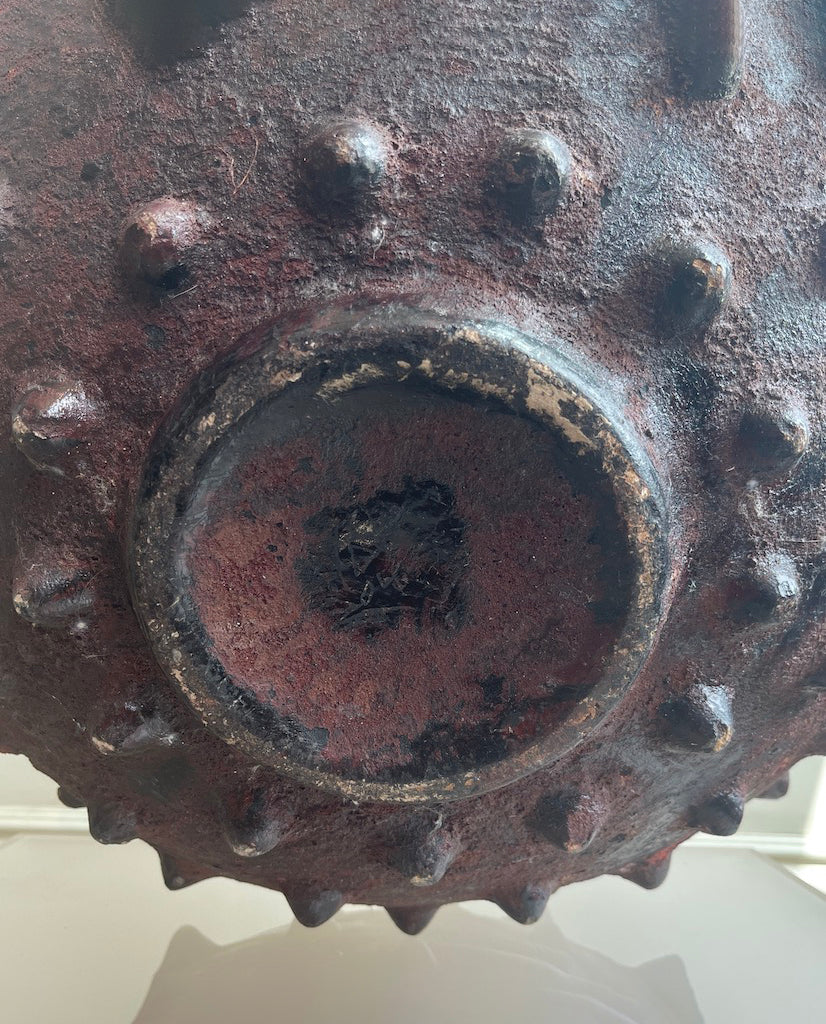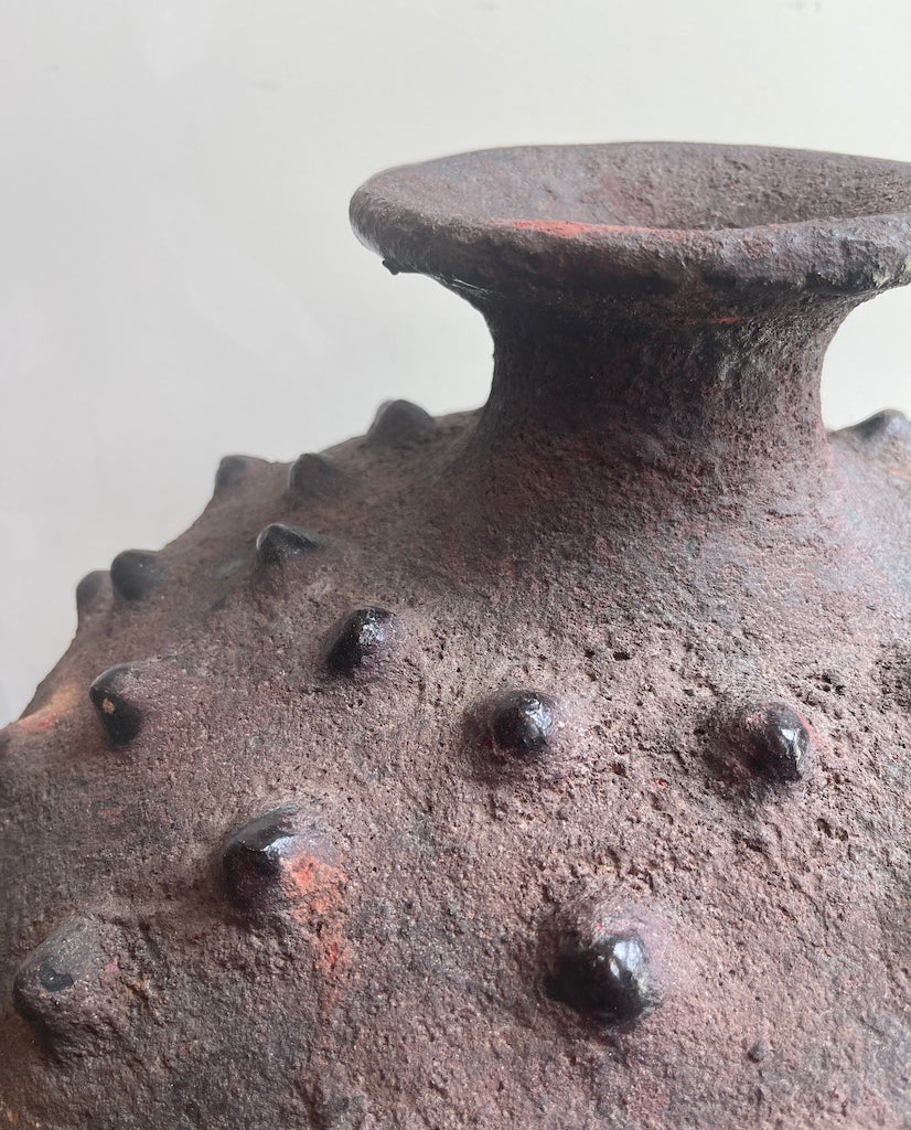 of massive ovoid form with high relief concentric spines, rising to narrow neck and flaring to circular rolled rim, ending in flat bottom; the whole enriched with mottled red, black and brown “rustic” glaze