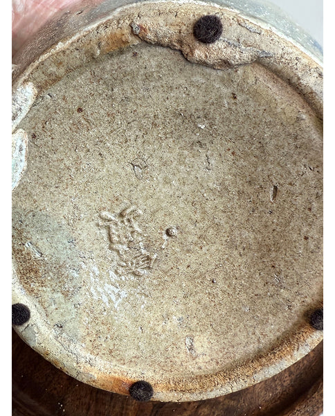 of bulbous ovoid high shouldered form, tapering to rolled rim and tapering gently to flat foot; the whole enriched with iridescent blue and white glaze, Chinese character for water and ?, on base