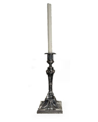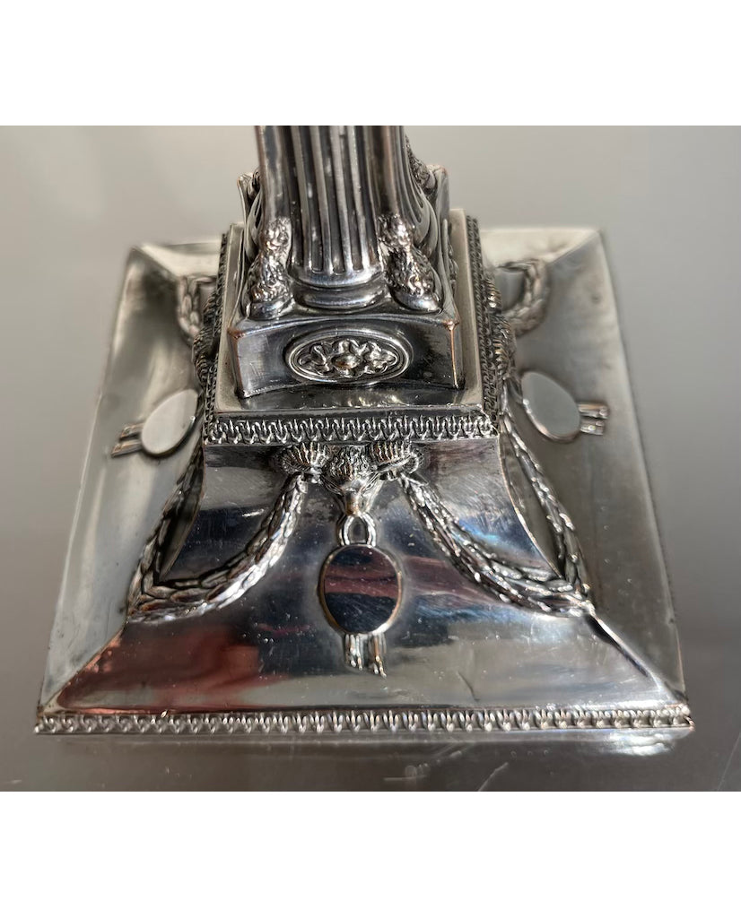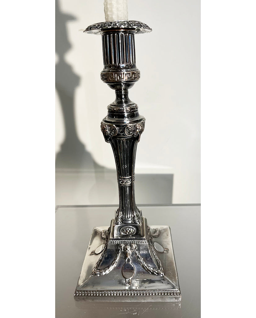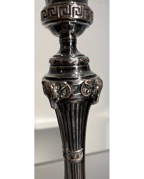 in the Adams style, with the articulated tapering circular section fluted stem with moulded and shaped ram’s heads at the shoulders, supporting stop-fluted urn with Greek key trim and later foliate bobeche; the whole raised on downswept square section base with leaf-tip moulded edge, centering similar ram’s heads with foliate swags suspending cabochon medaliions