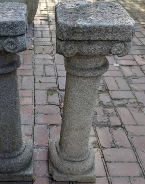 Each with cylindrical shaft surmounted by Ionic carved capital, raised on square plinth with circular socle