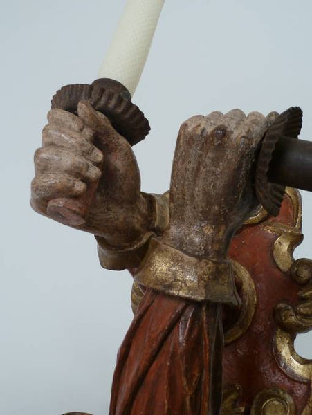 arm, extending to a hand grasping a cylindrical tole candlestick with flaring