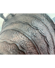 each deep dish oval form with irregular shell - like ribbing, fitted at the shoulders with naturalistic loop handles, rising to flaring rim, tapering intensely to circular flaring flat foot; the whole enriched with various relief conk shells and snails