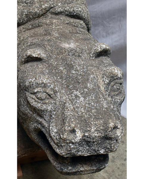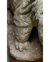 each massive ully realized carved and molded figure depicting seated hippopotamuses, their heads pushed forward roaring, deep folded skin on the back and legs; the whole raised on rectangular low plinth