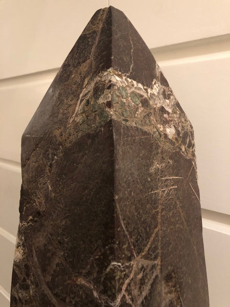 of "Bruno-Rossiccio," in classic tapering square-section form with slight entasis rising to pyramid top, seated on articulated moulded base, the whole raised on conforming carerra marble stepped plinth and retaining indications of previous mounts