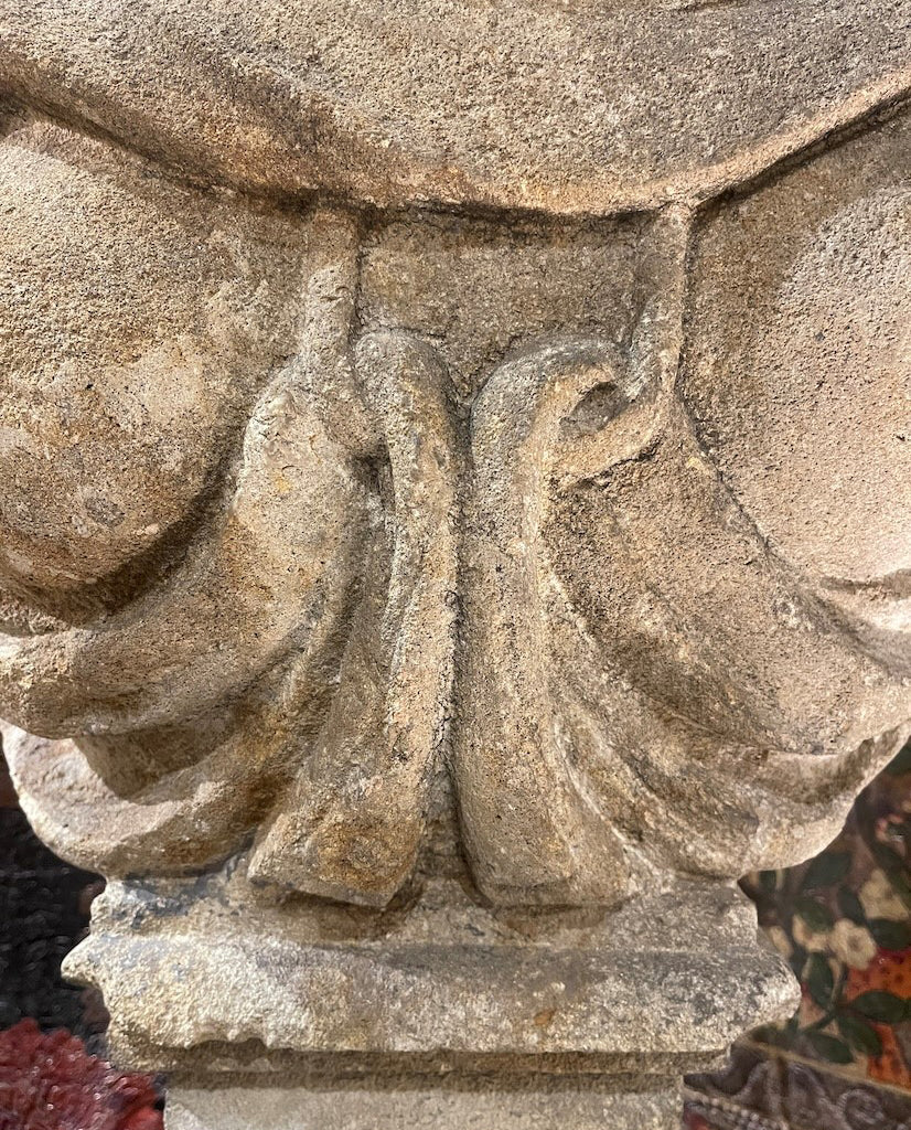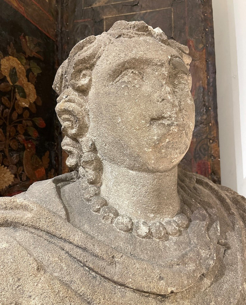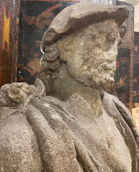 the frontally fully sculpted male and female figures with classically draped cloak, raised on concave rectangular sockle; now mounted on absolute black granite rectangular tapering plinths