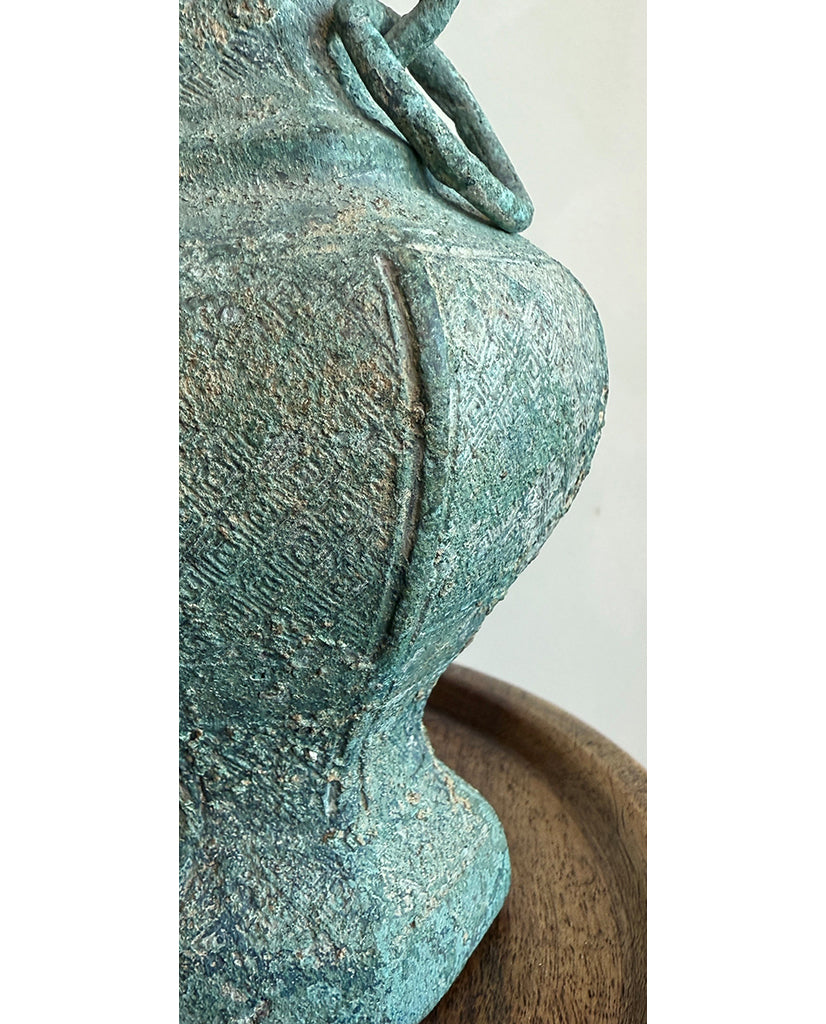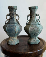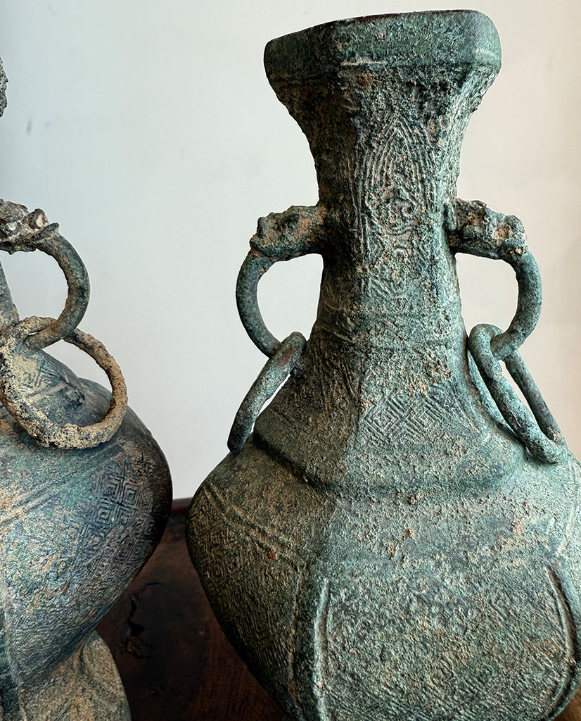 each of vasiform hexagonal shape, tapering at the neck with applied dragon head loose drop ring handles, flaring to flat rim and raised on tapering base with flat foot; the whole enriched with incised lewen reserves with cicada wings at the neck and retaining archeological bronze verdigris patination