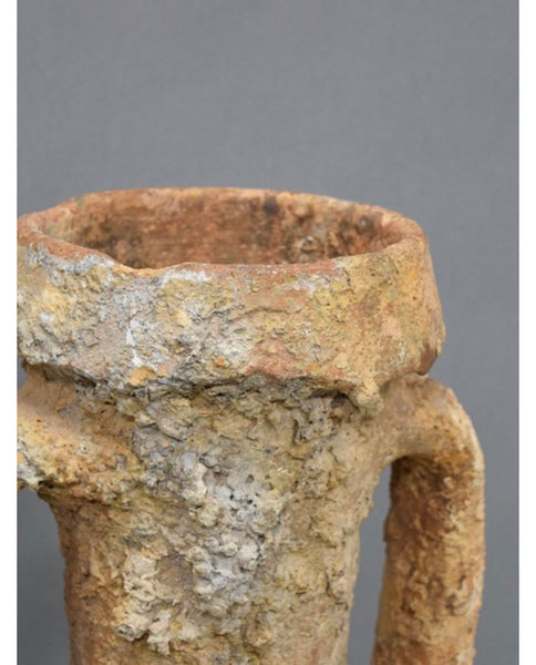 the elongated conical form with articulated shoulder and tapering neck fitted with strap handles, rising to flaring canted rim; the whole displaying