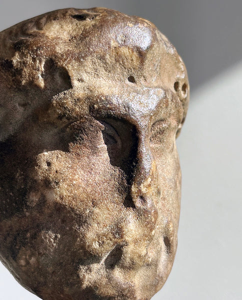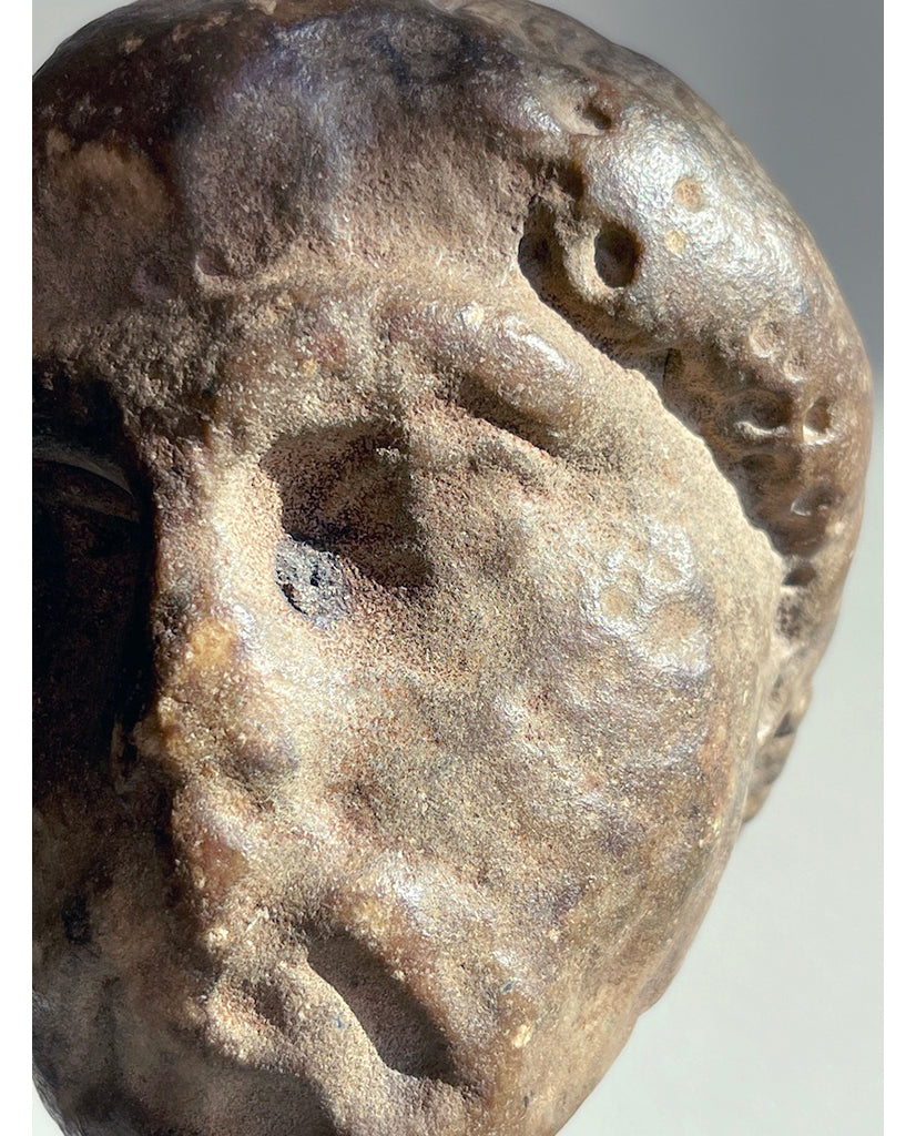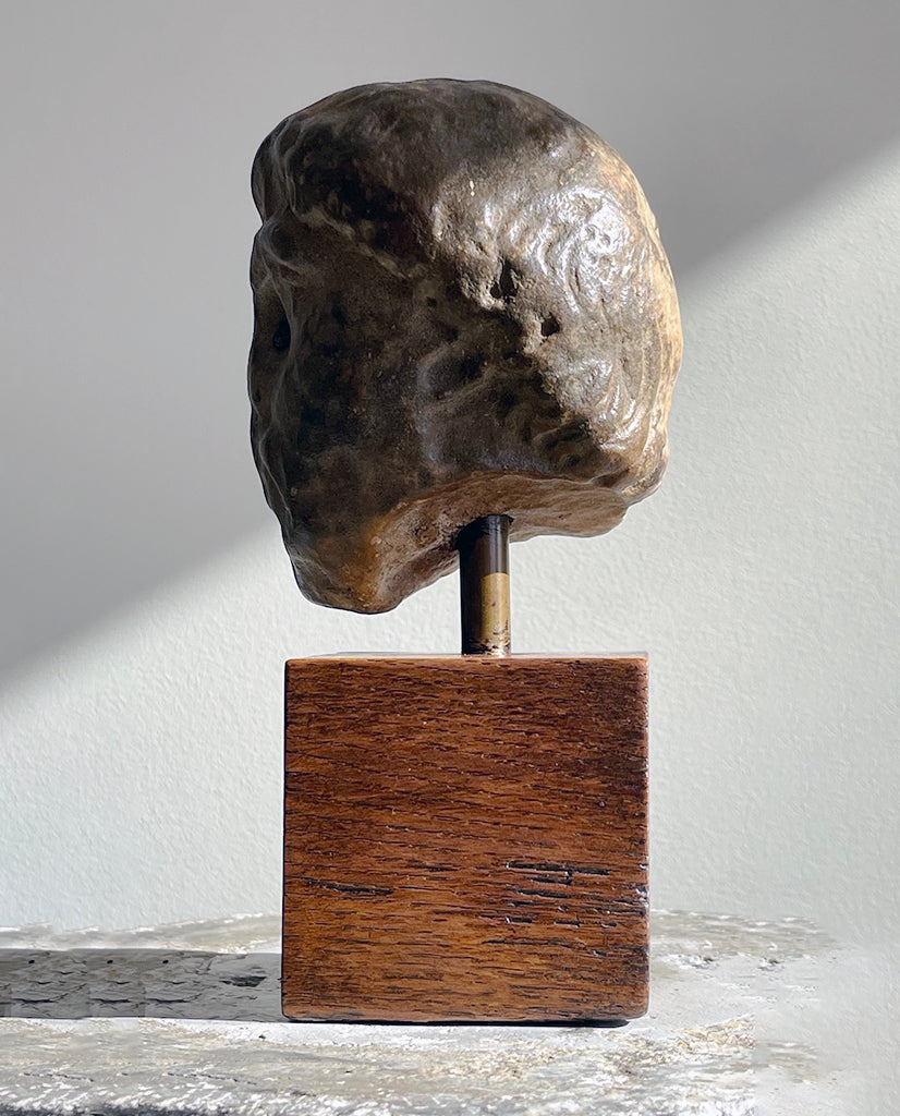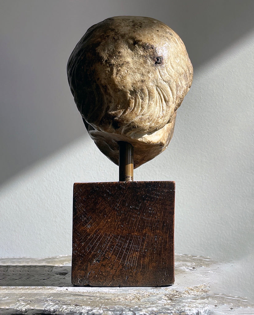 depicting fully realized carved and moulded head of a male youth, with thick curly wavy hair, beard and mustache, inset open eyes under heavy brows; the whole battered and displaying archeological patination, now mounted on square section oak plinth