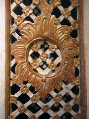 the circular white enameled face within moulded and shaped hood, the sides fitted with floral studded, fret access doors, terminating in carved foliate volute scrolls, over bombay shaped pendulum case with hinged door and with similar side access panels, on shaped and moulded plinth raised on carved lion paw feet, the whole retaining original painted finish