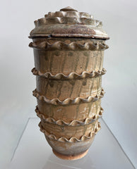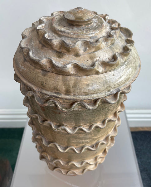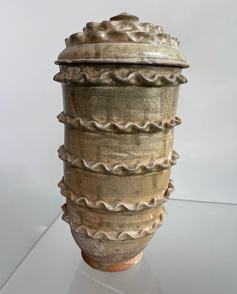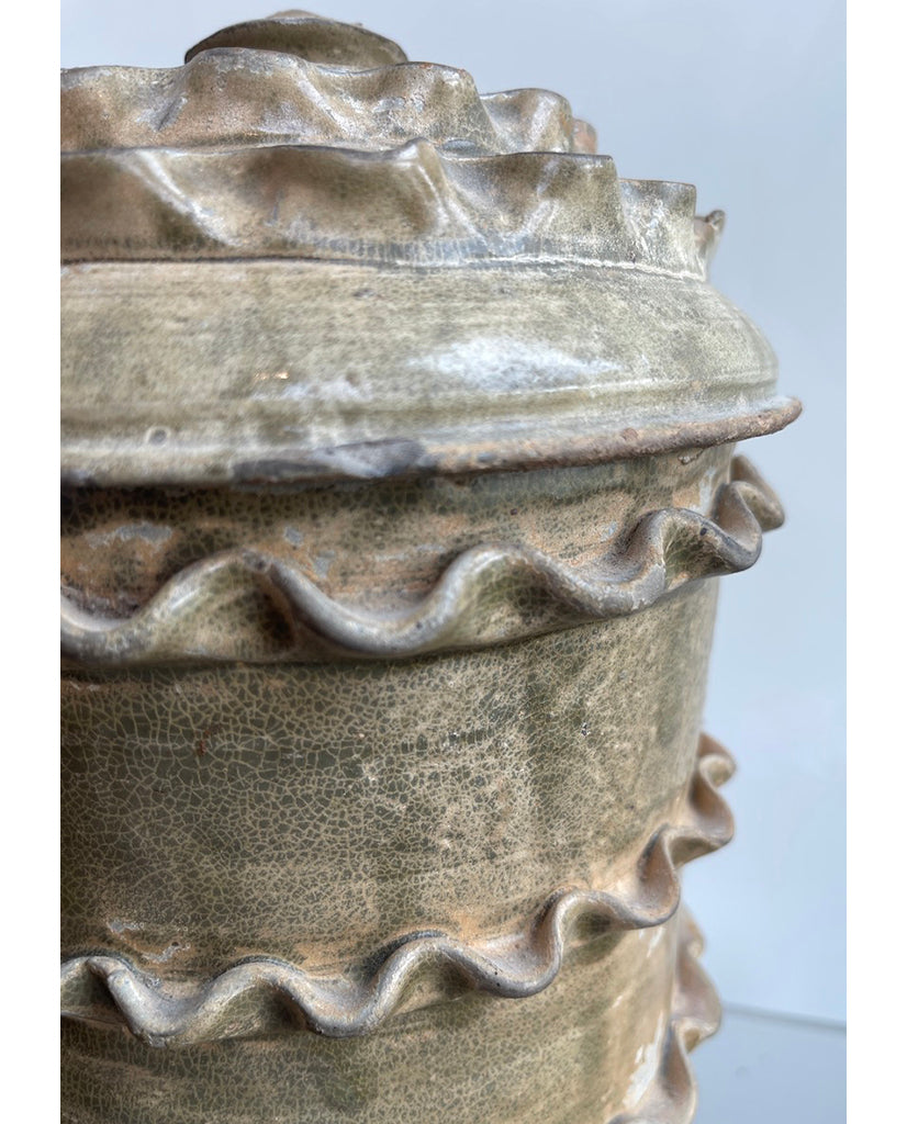 of towering circular section deep dish form, with applied concentric wave form high relief bands, fitted with conforming domed cover with similar wave form bands centering domed handle, tapering to slightly flared flat foot; the whole enriched with monochromatic green glaze