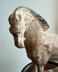 of animated fully realized standing horse form, in dynamic pose with head arched and turned to the left, the mane and tail dressed, raised on integral rectangular plinth; the whole retaining traces of cold slip white and black painted decoration with archeological patination