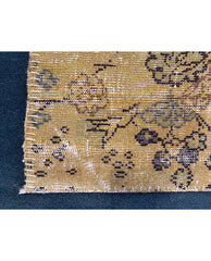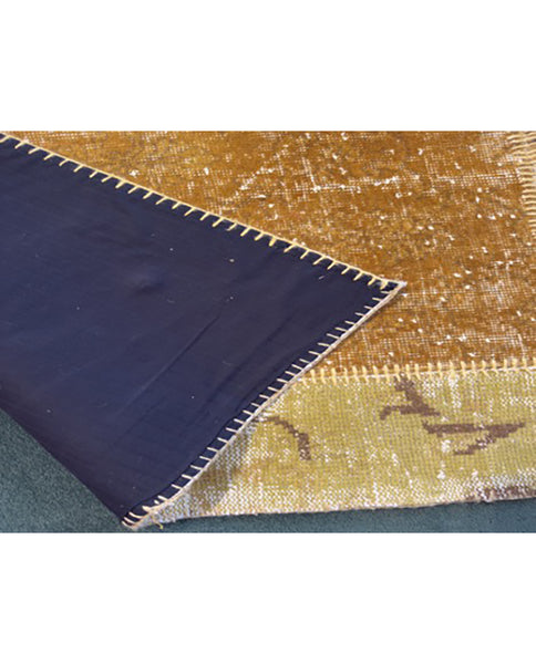 of primarily ochre and brown square form, consisting of various rectangular assembled carpets with floral and foliate decoration, loosely sewn together with heavy ochre thread, backed with black cotton liner