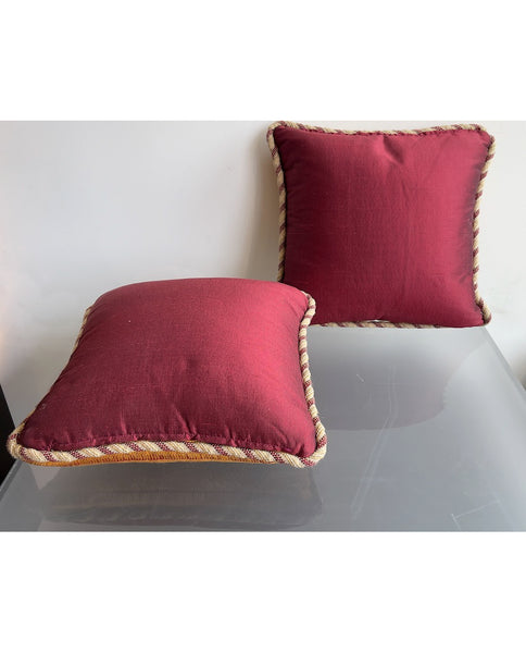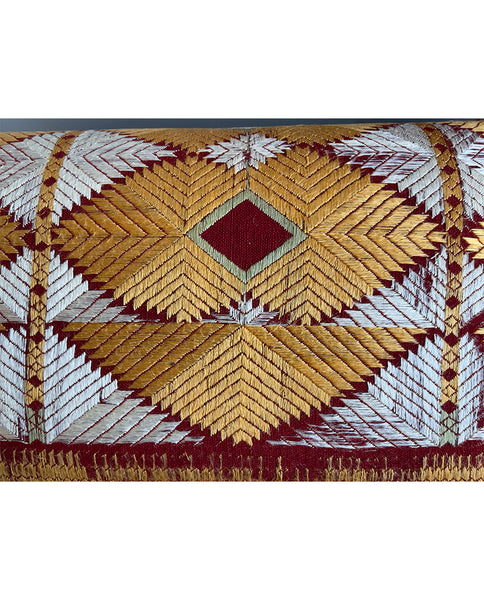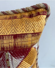 each square down filled form displaying geometric ochre, red and white patterns, trimmed in ochre,red and white thick cord, with red silk backs