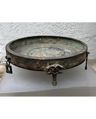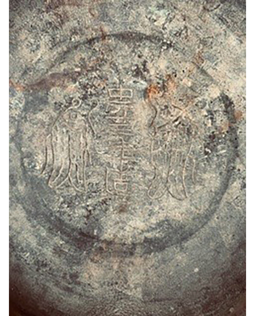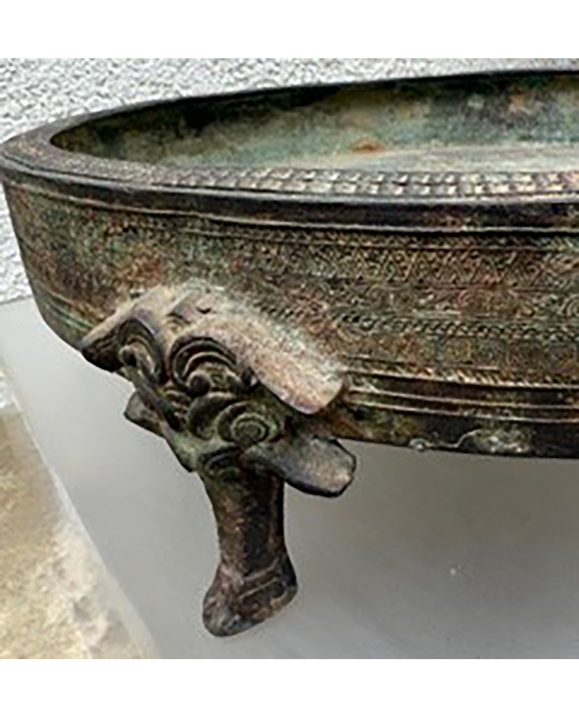 of massive shallow dish form with straight sides rising to flat rim, fitted at the shoulders with stylized elephant head square drop ring chains(one missing); the whole raised on high relief dragon head tripod feet ending in hoof foot; the whole enriched with various low relief geometric bands on the sides and rim, the interior with characters flanked by koi