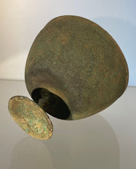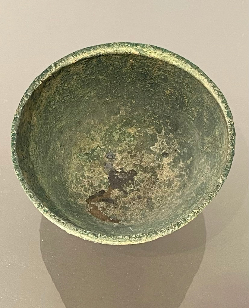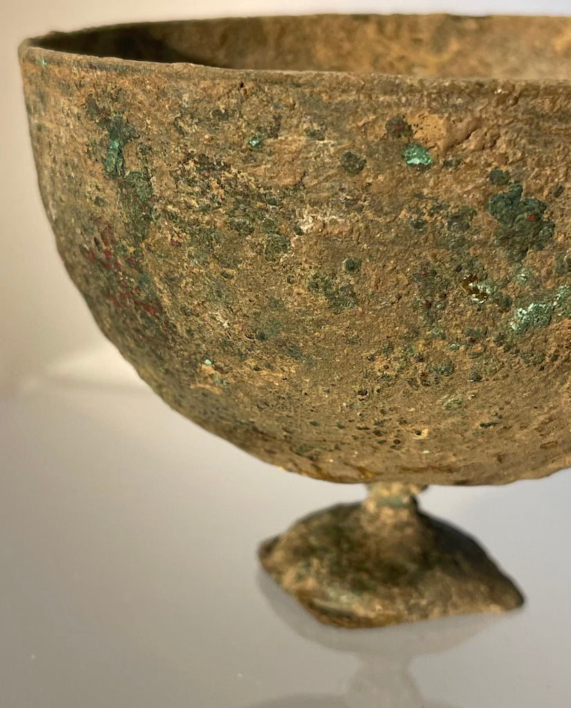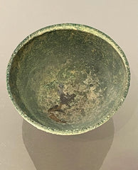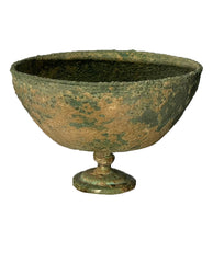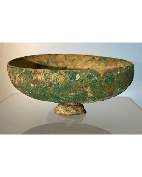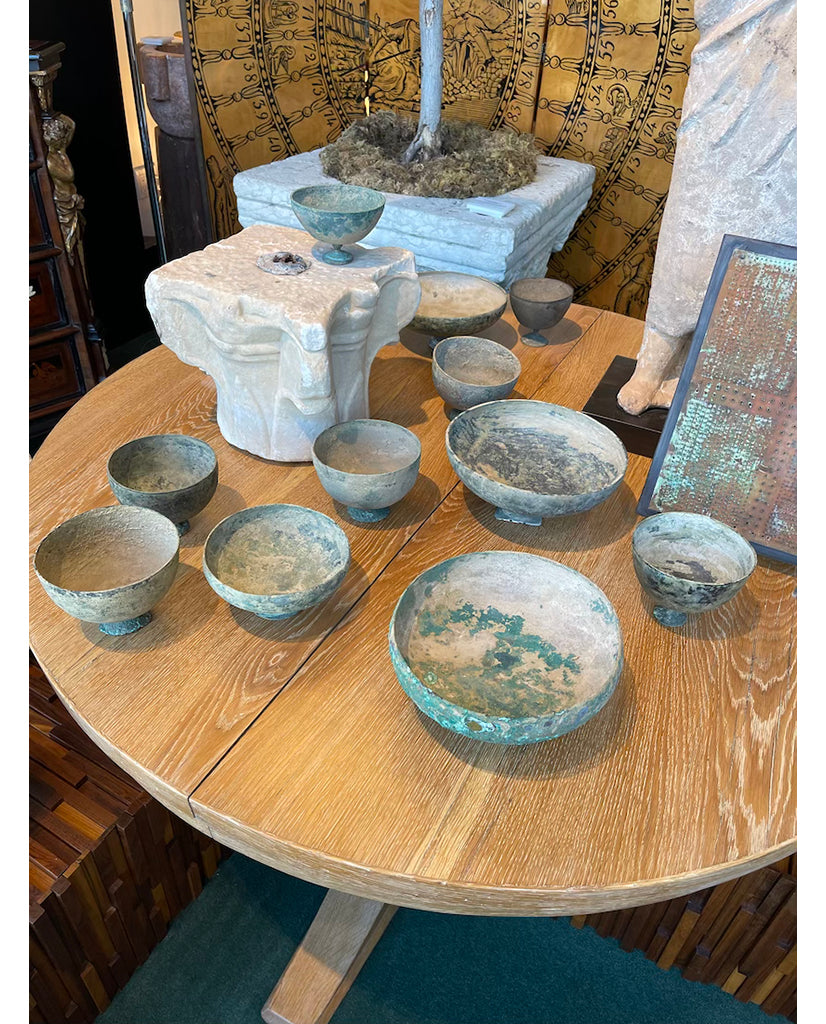 each of various circular deep dish forms tapering to sharp edge and raised on circular section or square section feet; some with incised geometric bands, and all with archeological patination