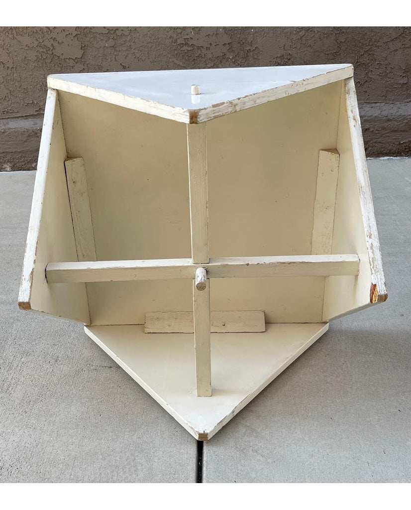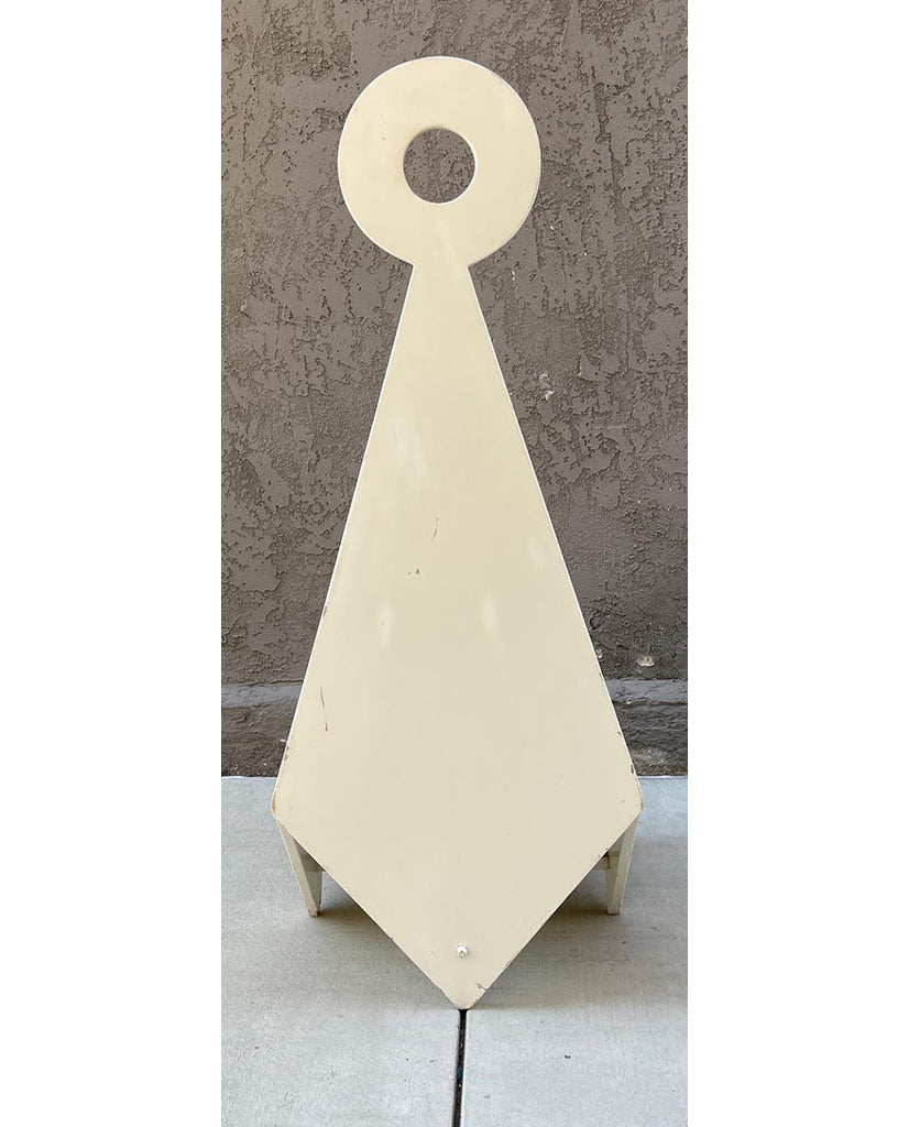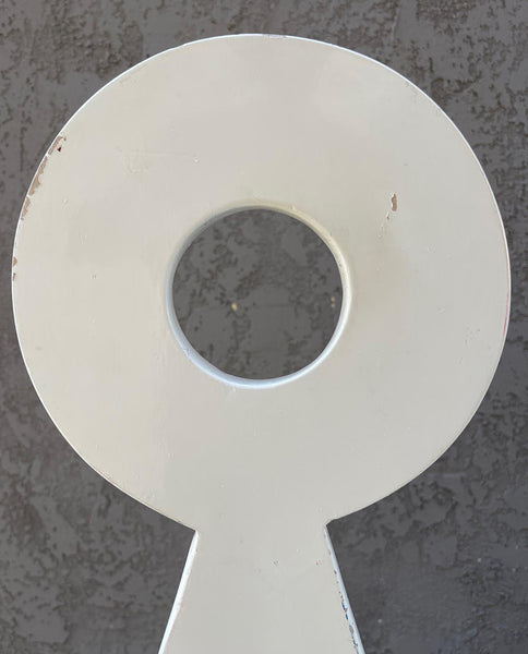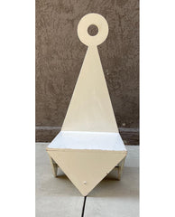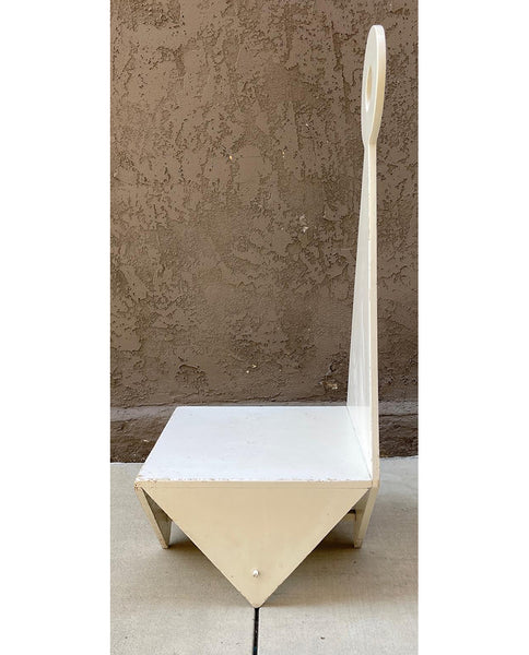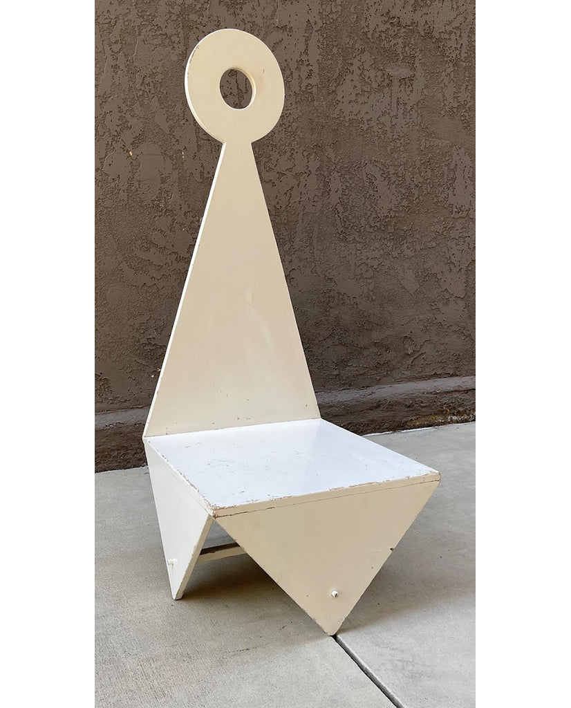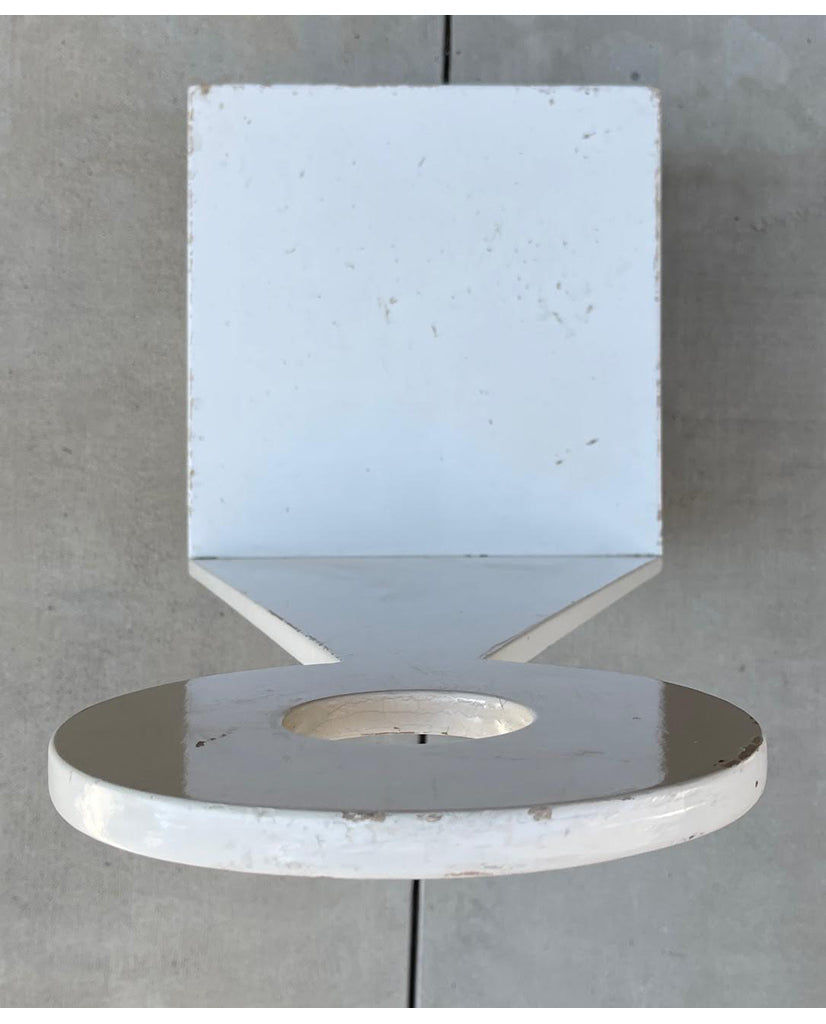 of highly unusual geometric form, the triangular back tapering to contiguous circular pierced finial top, joined to square seat, the whole raised on upside down triangular four sided feet each with central extended irregular dovel and returning original white painted finish