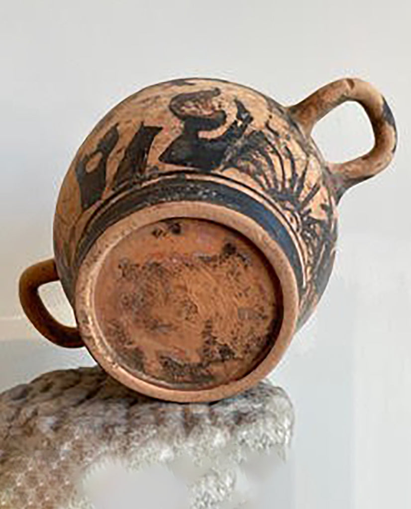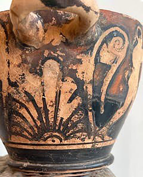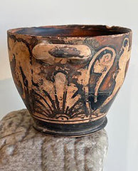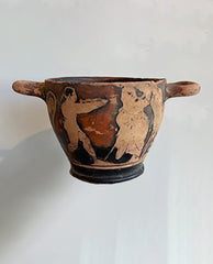 of deep dish ovoid form, fitted at the knife edge rim with molded ear shaped loop handles, tapering to flaring foot; the whole enriched with painted decoration depicting central band of standing figures, male and female, flanked by palmettes, all silhouetted on black ground, with black banded base