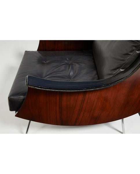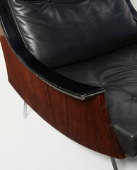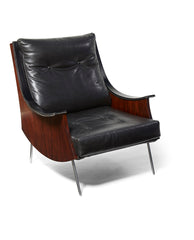 the rectangular back with shaped sides contiguous with seat, flat conforming leather upholstered arms; the whole raised on chrome plated circular section flaring legs and fitted with button tufted cushions